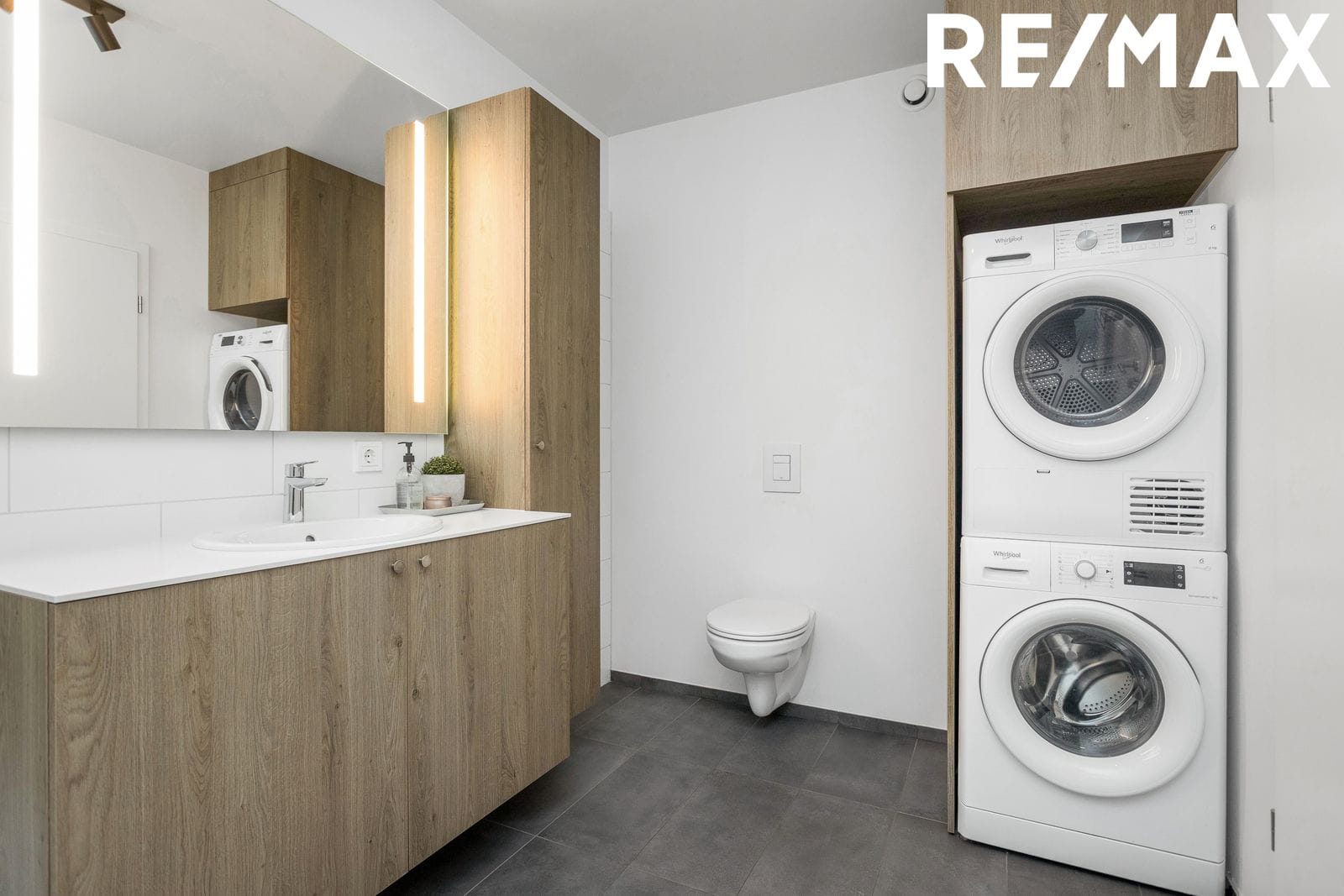 Tengi er fyrir þvottavél og þurrkara inn á baðherbergi með innréttingu og góðum skáp fyrir ofan.