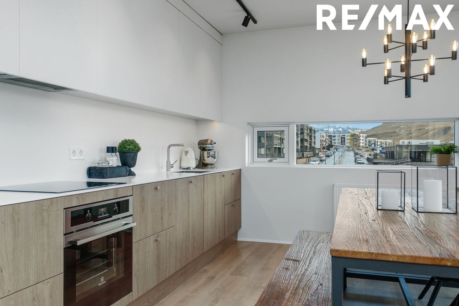 Eldhús er í opnu og björtu rými með vandaðri og stílhreinni innréttingu frá Formus, smíðað upp í loft. Helluborð, bakaraofn og háfur er frá Electrolux, undirlímdur vaskur í borðplötu. Möguleiki er að bæta við eldhúseyju. Íbúðin er á enda svo rýmið er einstaklega bjart og með gólfsíðum gluggum að hluta. Úr eldhúsi er útgengt út á