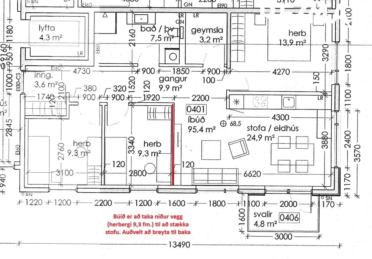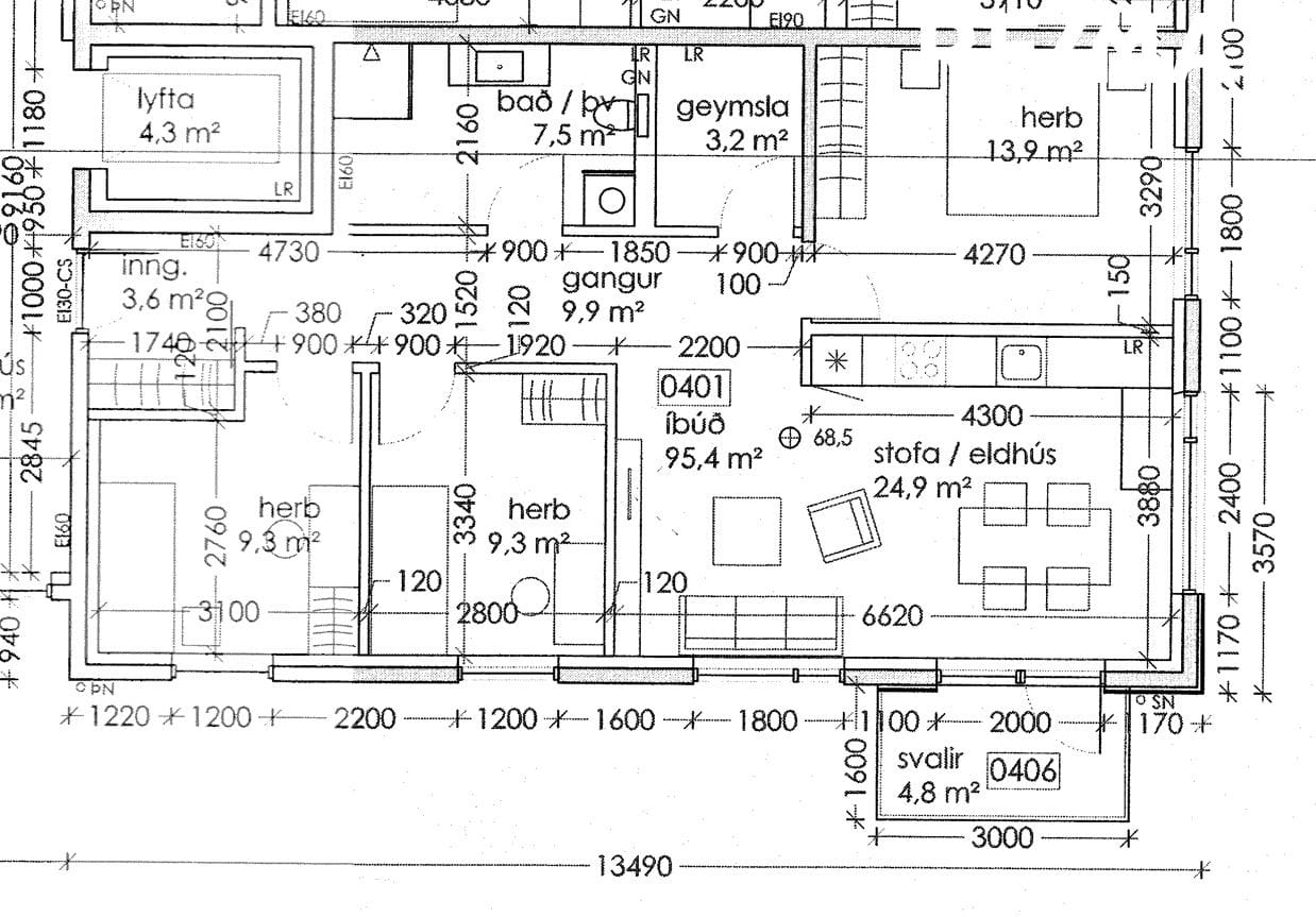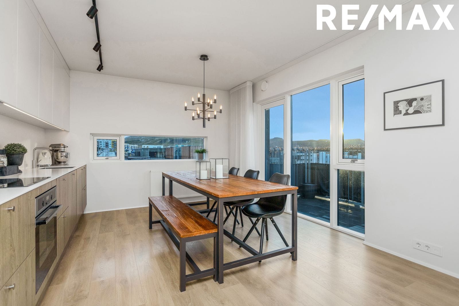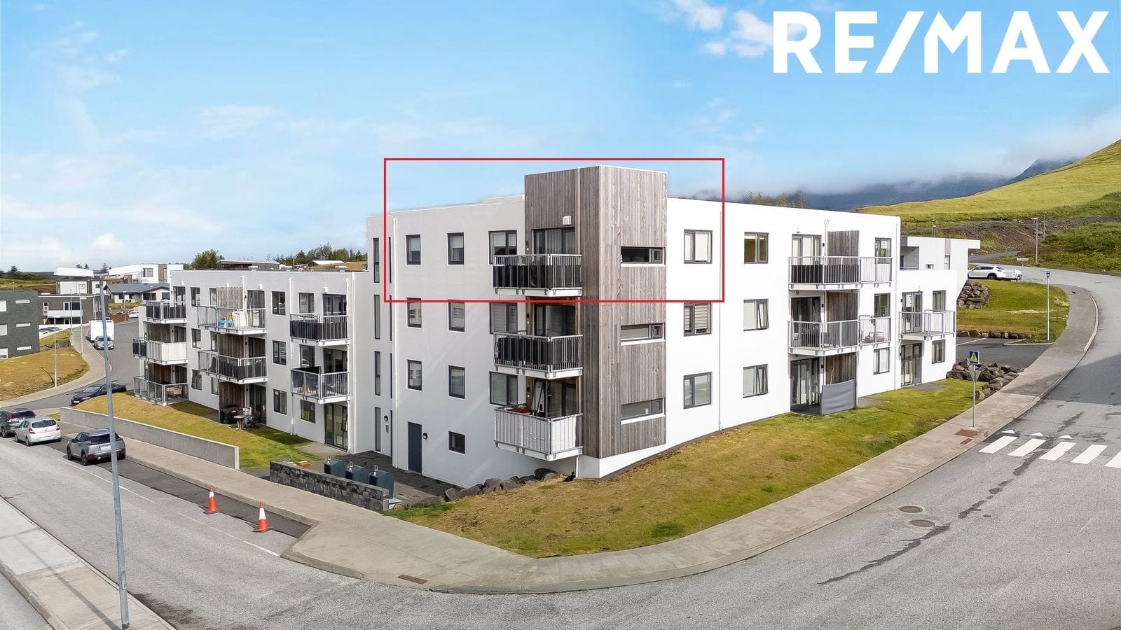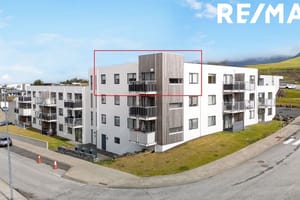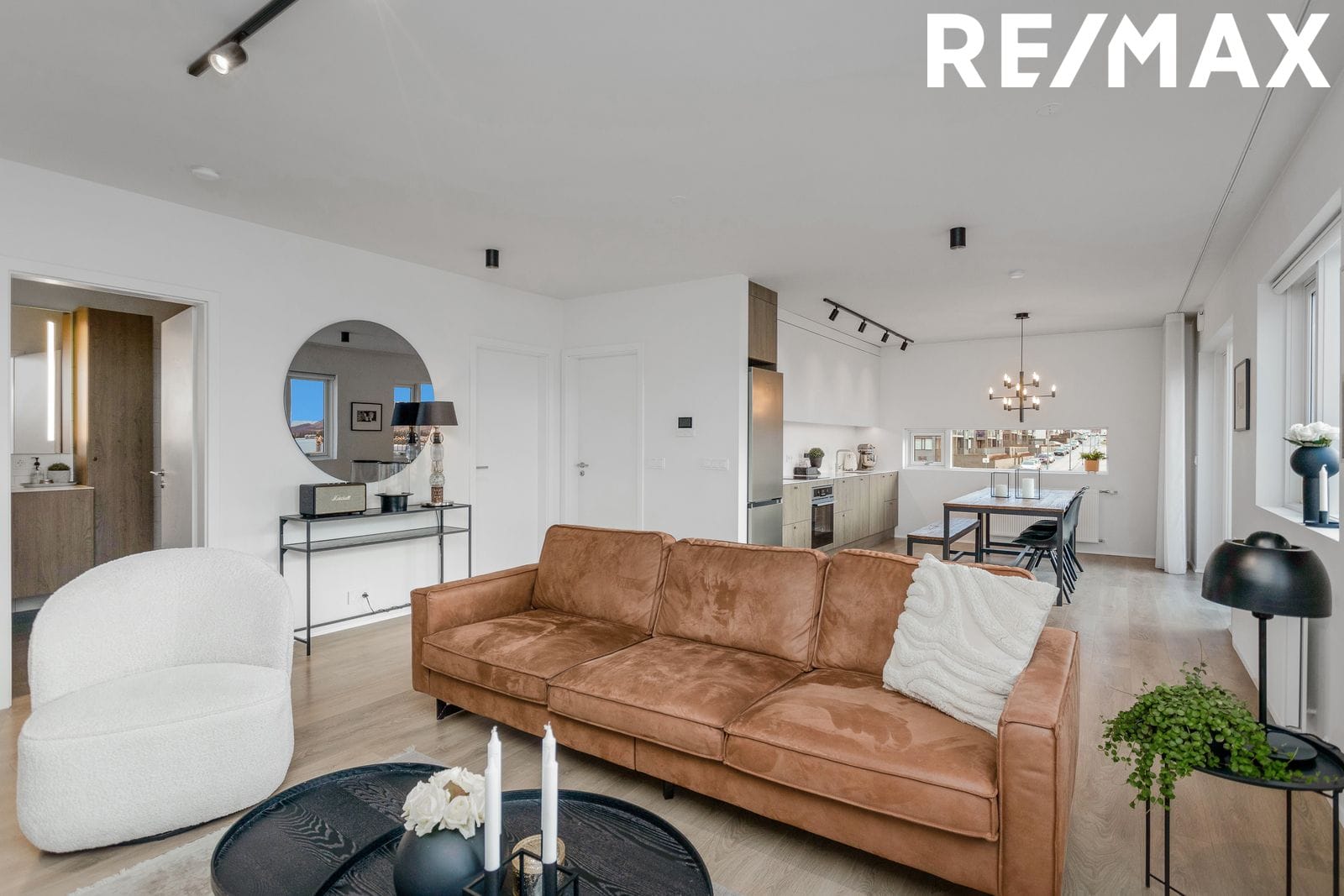 svalir til suðurs með einstöku útsýni.Borðstofa og stofa er í samliggjandi opnu rými við eldhús. Samkvæmt byggingarteikningum er gert ráð fyrir þriðja svefnherberginu í stofu,