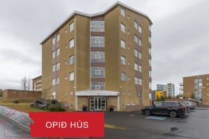 Aðkoma: Malbikað stórt bílplan með mörgum bílastæðum við húsið. Inngangur í snyrtilegan stigagang.