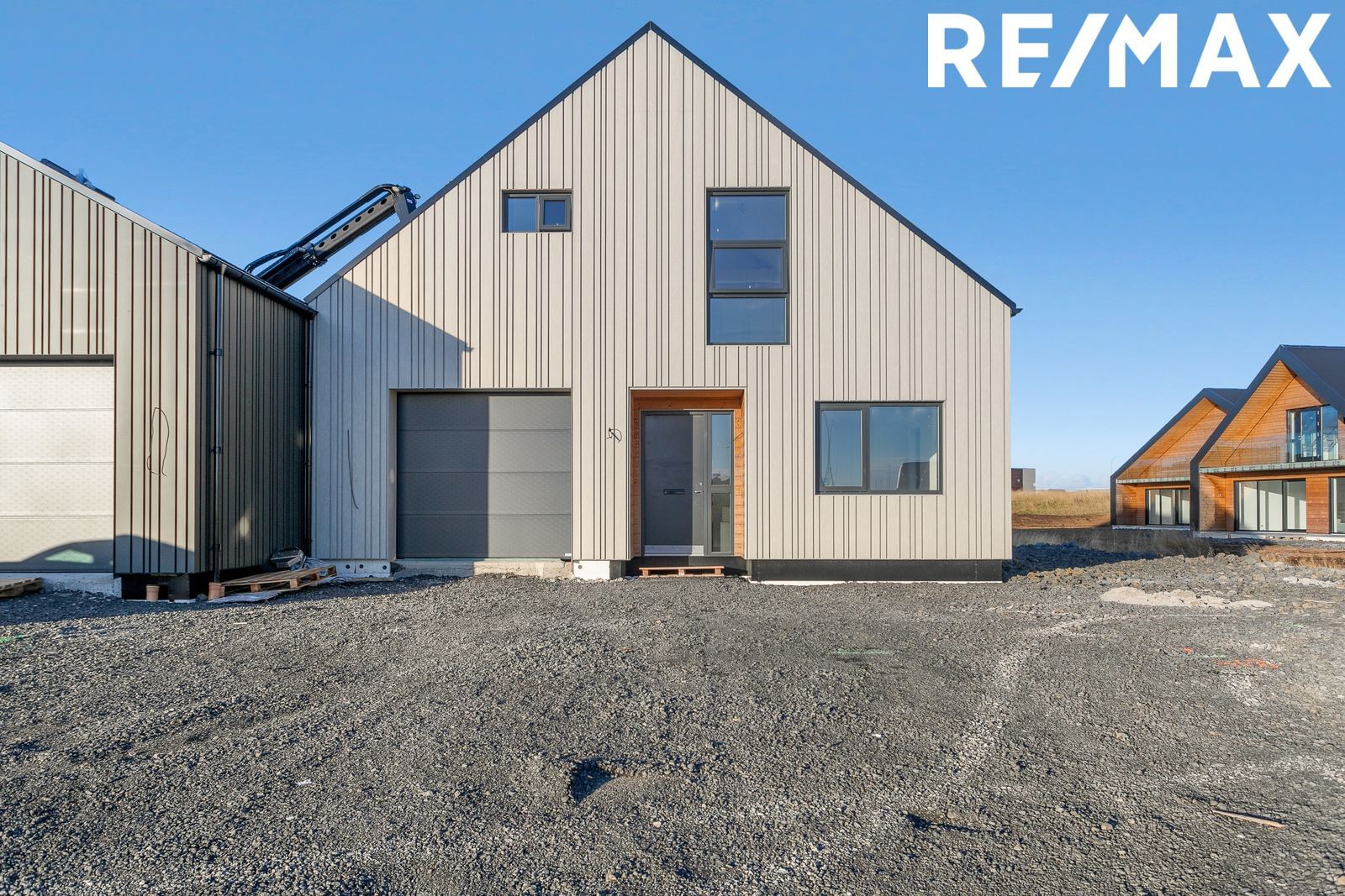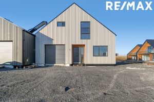 Skipulag og aðgengi Herbergjafjöldi: 3 svefnherbergi. Sjónvarpshol á efri hæð með möguleika á 4. herbergi (barnaherbergi/heimaskrifstofa/fjölnota rými). Alrými: Eldhús–stofa–borðstofa í opnu flæði með útgengi á verönd. Votrými: Tvö baðherbergi, eitt á hvorri hæð. Þvottahús: 2. hæð. Bílskúr: 32 m², innangengt úr íbúð. Lóð Verönd: Um 60 m² timburverönd að aftan Garður: Tyrfður og hellulagður að hluta. Burðarvirki, einangrun og gluggar Frágangur að utan: Húsið er fullbúið með álklæðningu frá Málmtækni. Gluggar: Ál/viður frá Byko. Einangrun: Samkvæmt gildandi byggingarkröfum á verktíma. Innanhúsfrágangur Veggir: Sparslaðir, grunnaðir og málaðir í einni umferð. Loft: Frágengin. Gólf: Flotuð. Hitakerfi: Gólfhiti í öllum rýmum. Raflagnir: Fullfrágengið Baðherbergi: Flísalögð og innréttingar frá HTH. Innréttingar og tæki sem fylgja við afhendingu Innréttingar: HTH (eldhús og baðherbergi) Eldhústæki: AEG. Blöndunartæki: GROHE. Lagnir, rafmagn og búnaður Heitur pottur: Undirbúningur er til staðar (lagnir). Kaldur pottur: Undirbúningur er til staðar (lagnir). Útisturta: Undirbúningur er til staðar (lagnir). Rafbílahleðsla: Fylgir. Lóð og utanhús Lóð: Tyrfð við afhendingu. Bílaplan: Hellulagt. Verönd: ~60 m² að aftan. Það sem eftir stendur Gólfefni (yfirborð): Lýsing: Ljós. Lokamálun: umferð 2 og 3