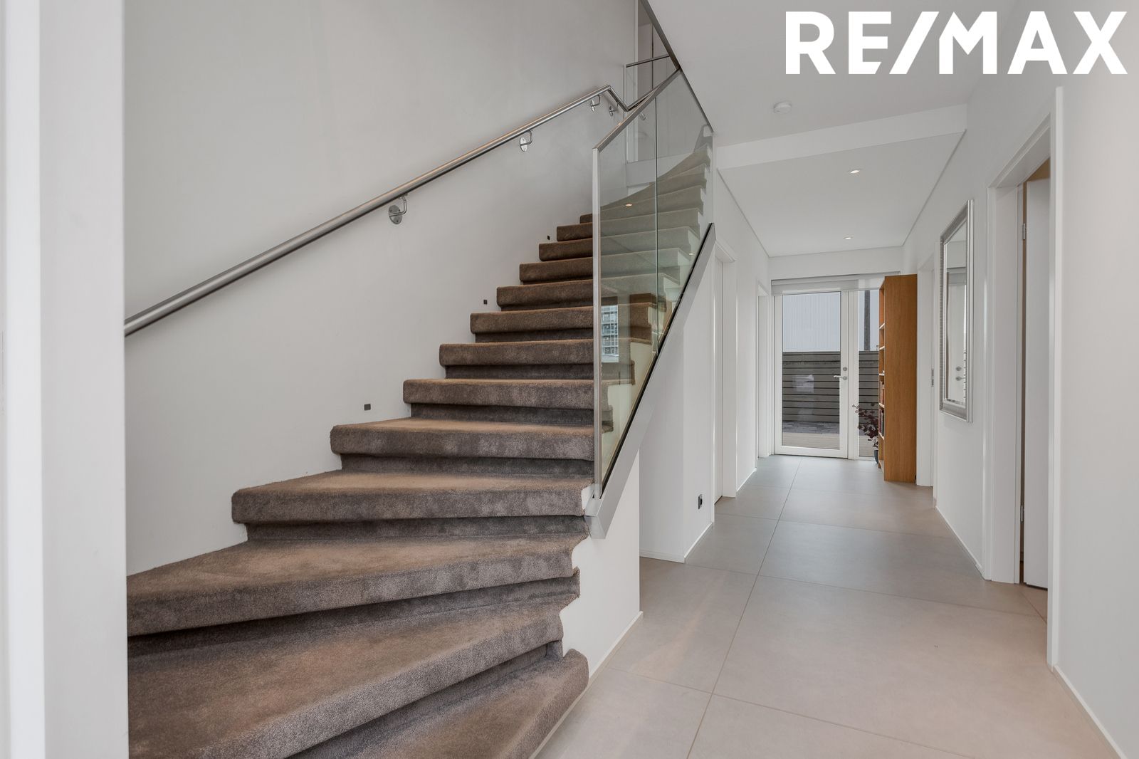 Stigi upp á efri hæð er teppalagður með glerhandriði.