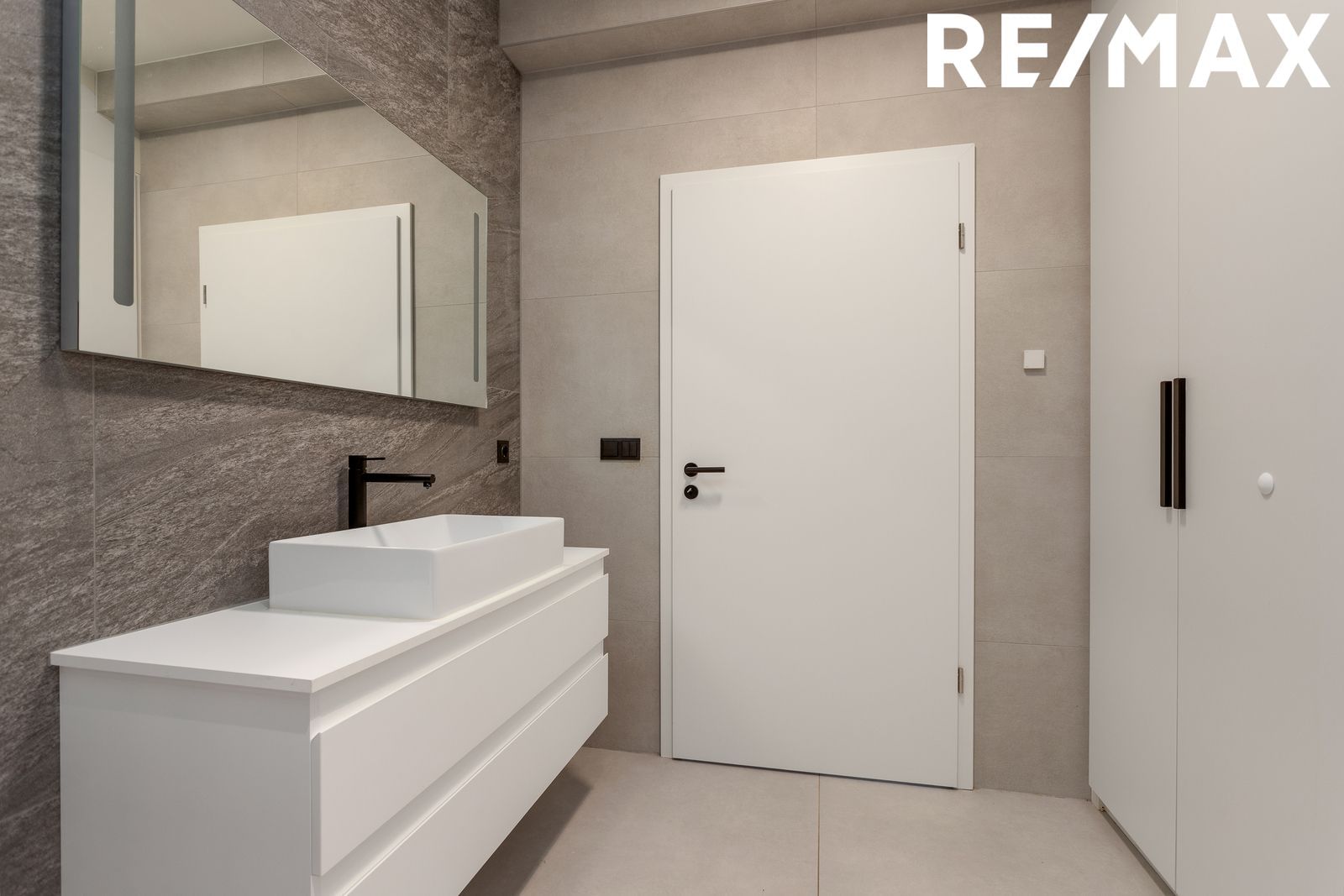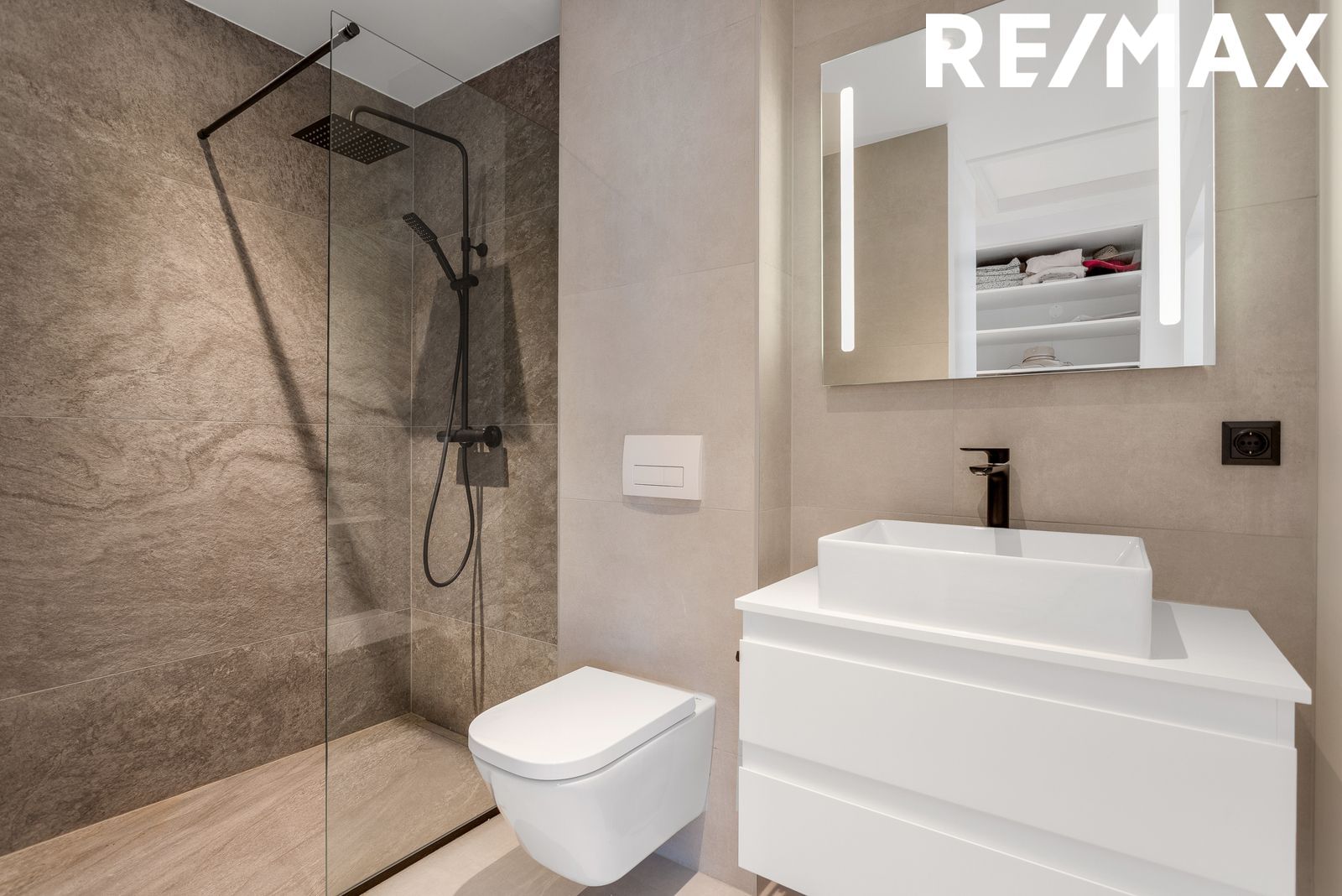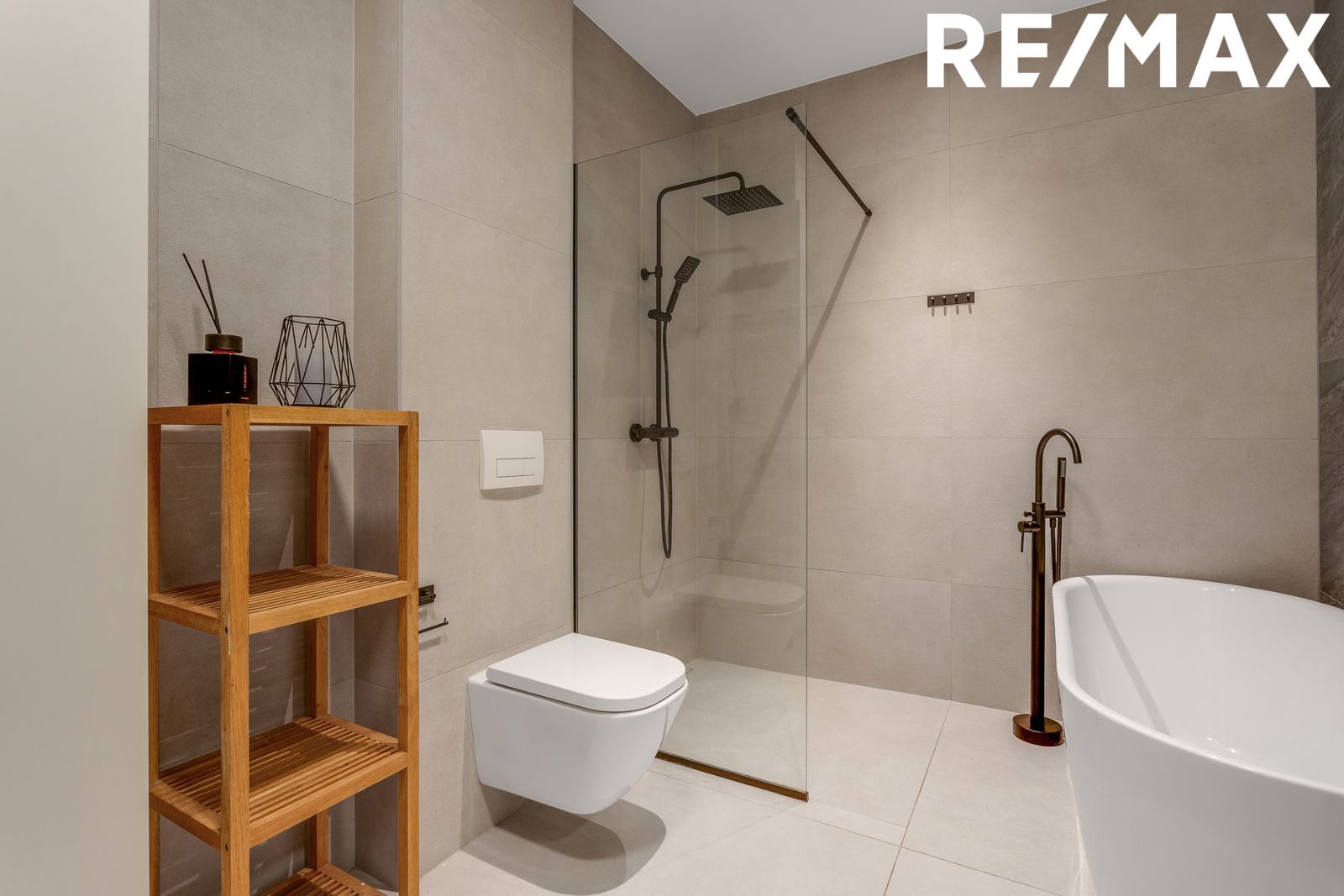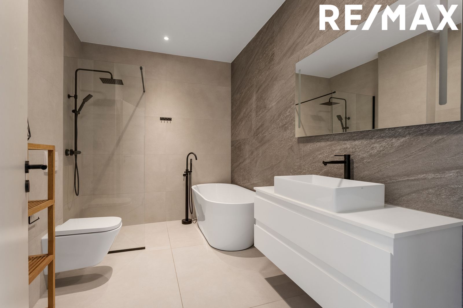 Baðherbergi er flísalagt með fallegri innréttingu, hvítum skáp og upphengdu wc, "walk in" sturtu og baðkari.