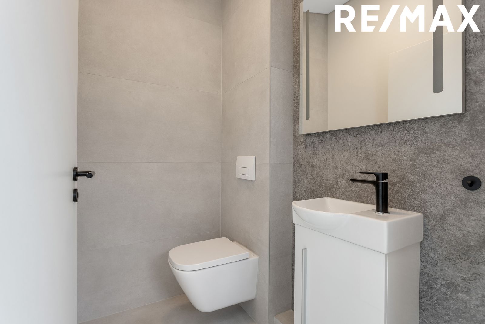 Gestasalerni er flísalagt með upphengdu wc og ljósri innréttingu.