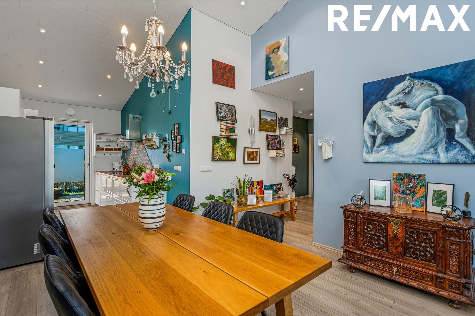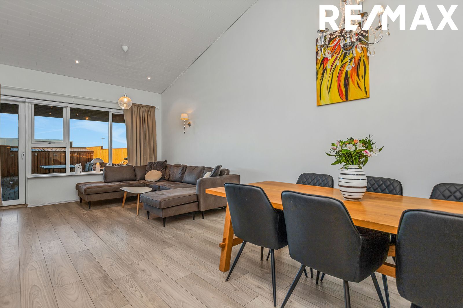 Stofa og borðstofa er í björtu opnu rými með aukinni lofthæð, harðparket á gólfum. Úr stofu er útgengt út á