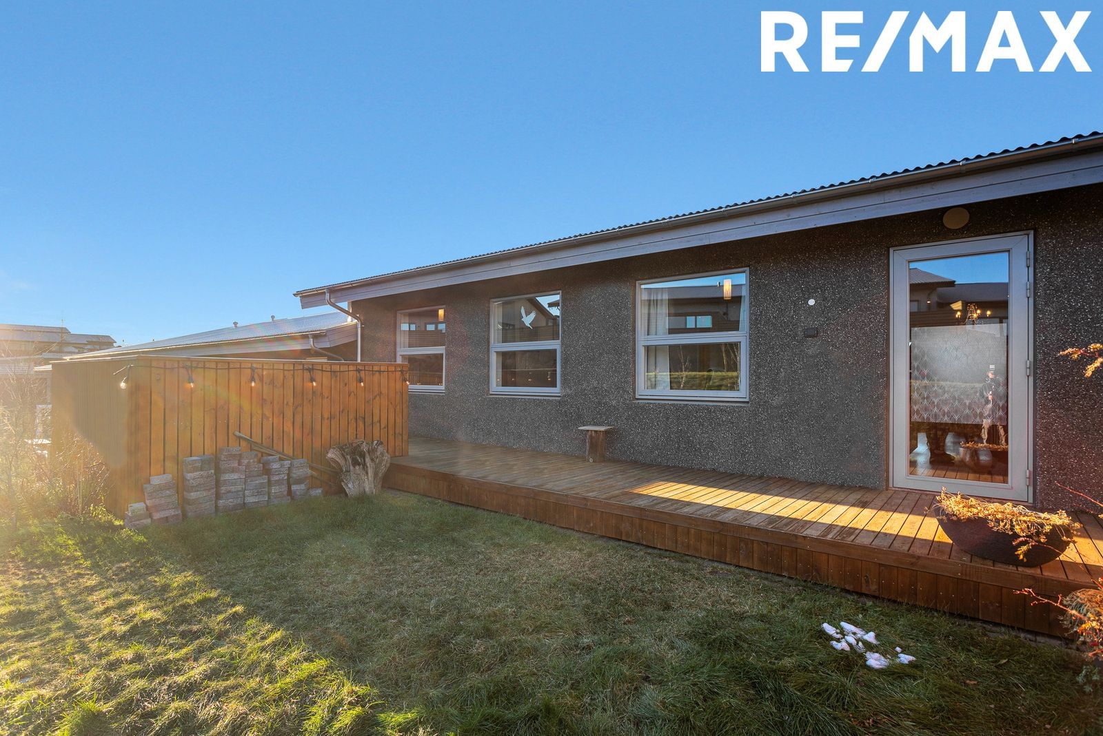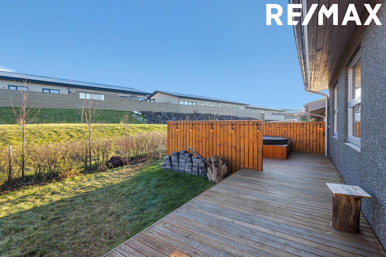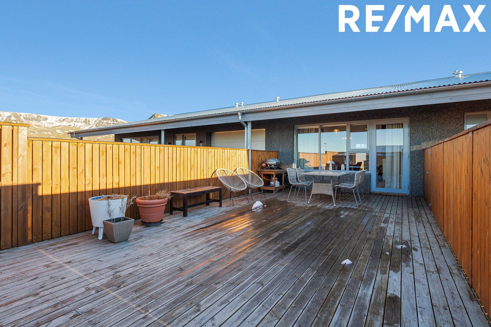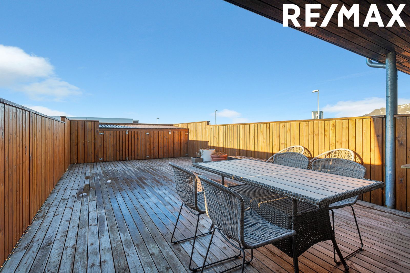 stóra og skjólgóða viðarverönd til suðurs með útigeymslu.