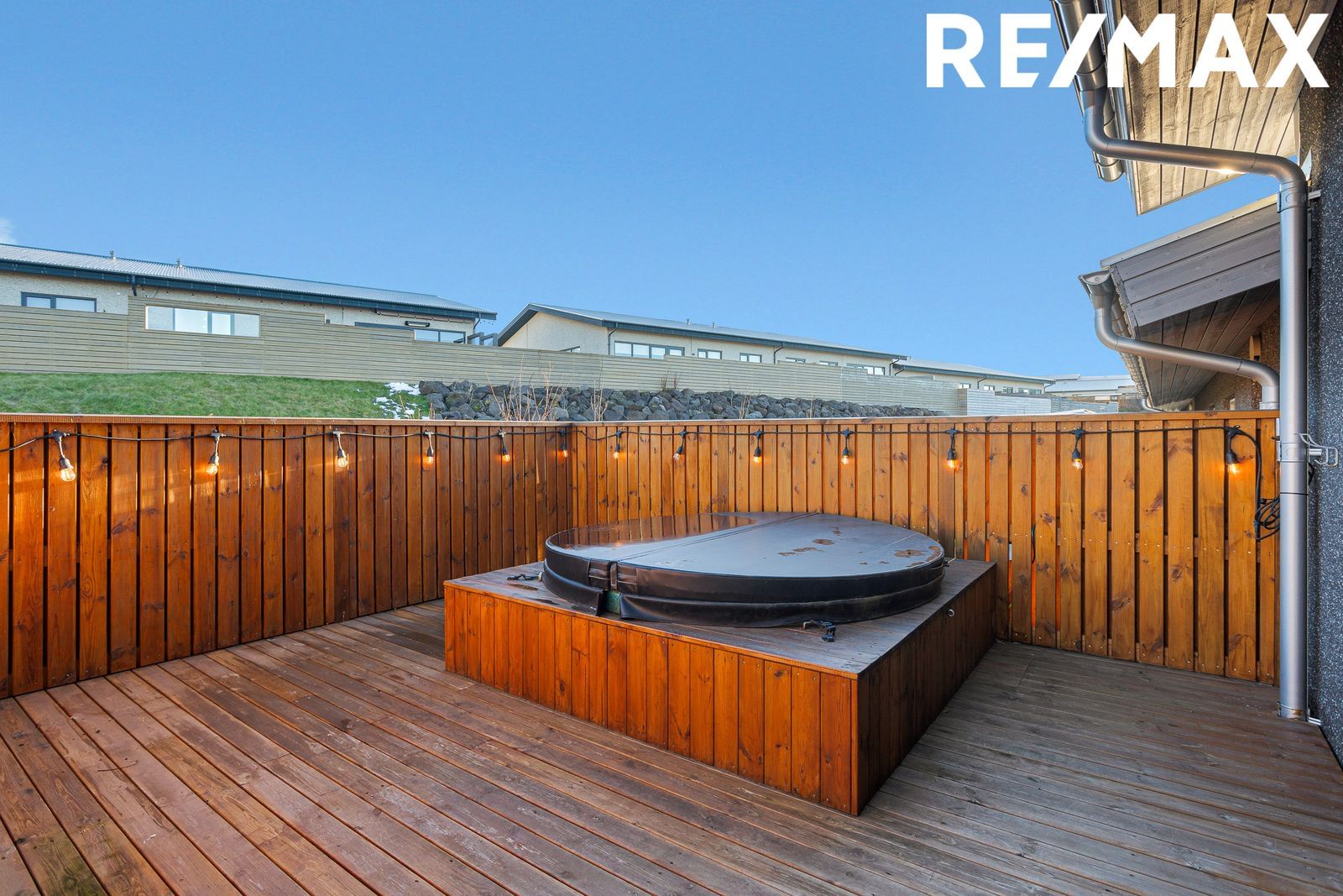 viðarverönd með heitum potti.