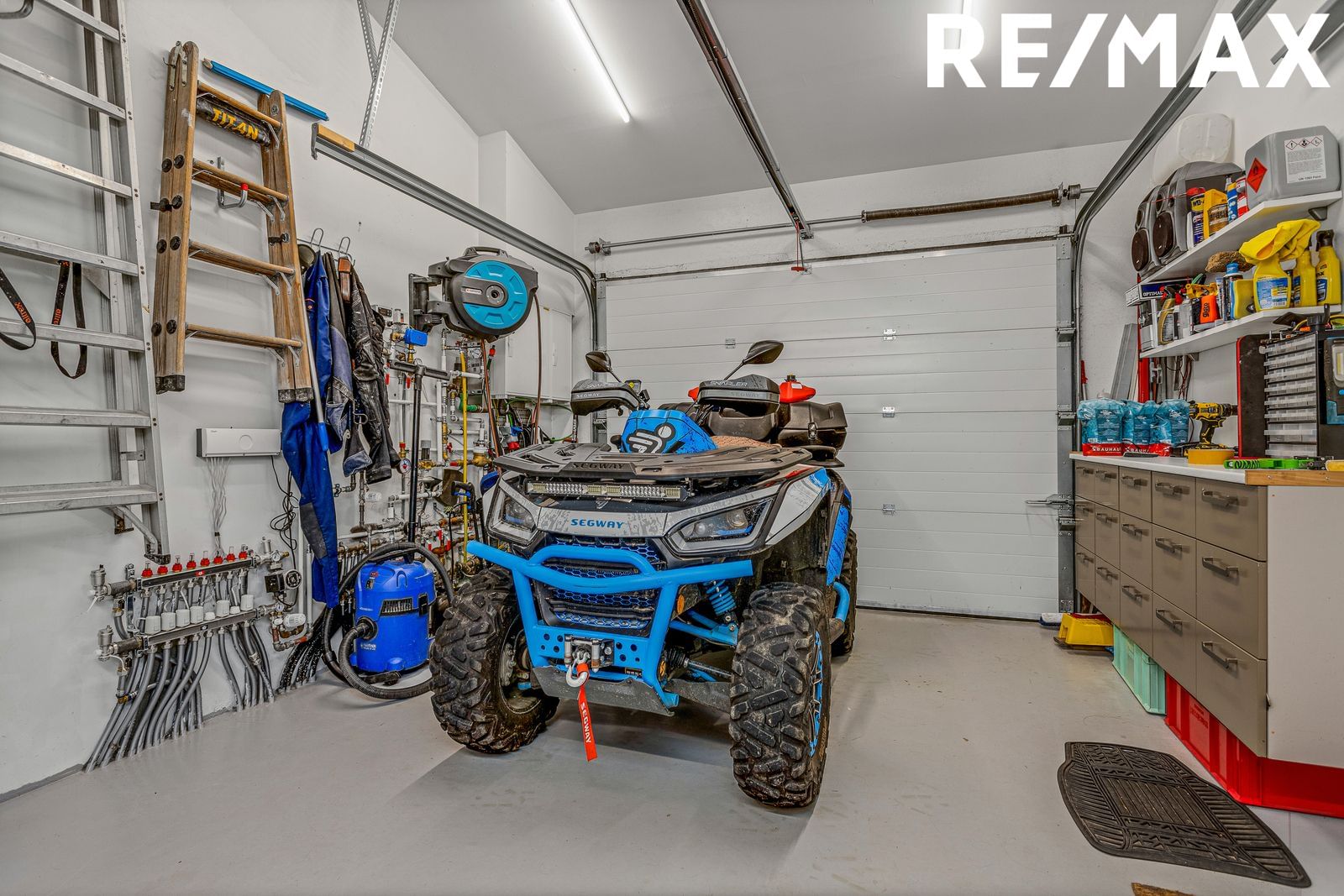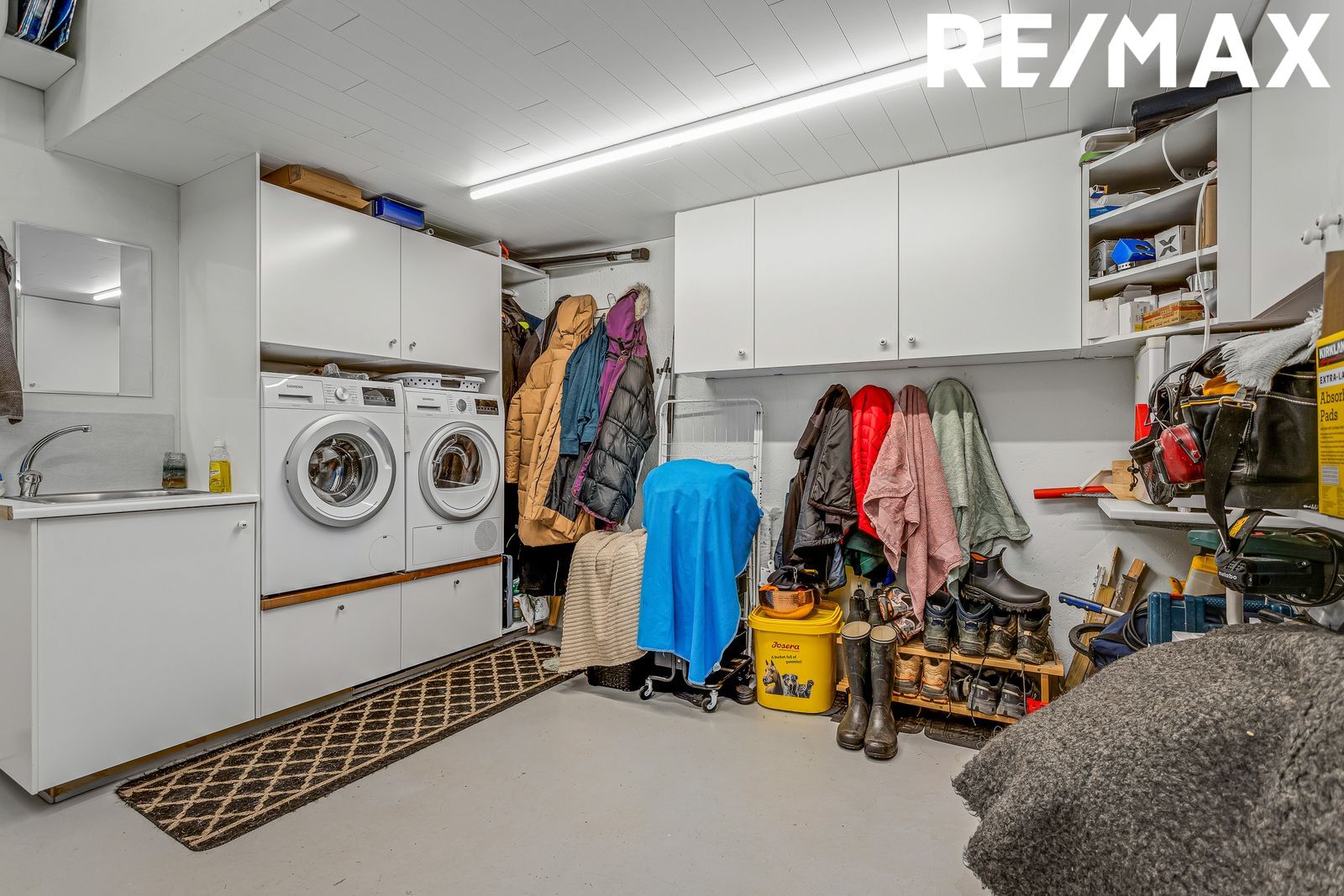 bílskúr er góð innrétting fyrir þvottvél og þurrkara ásamt skolvaski. Rafdrifin bílskúrshurð með fjarstýringu og