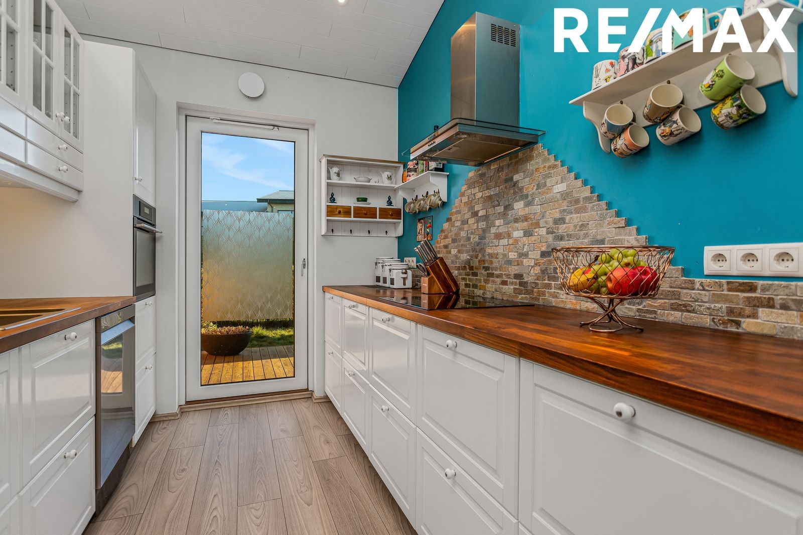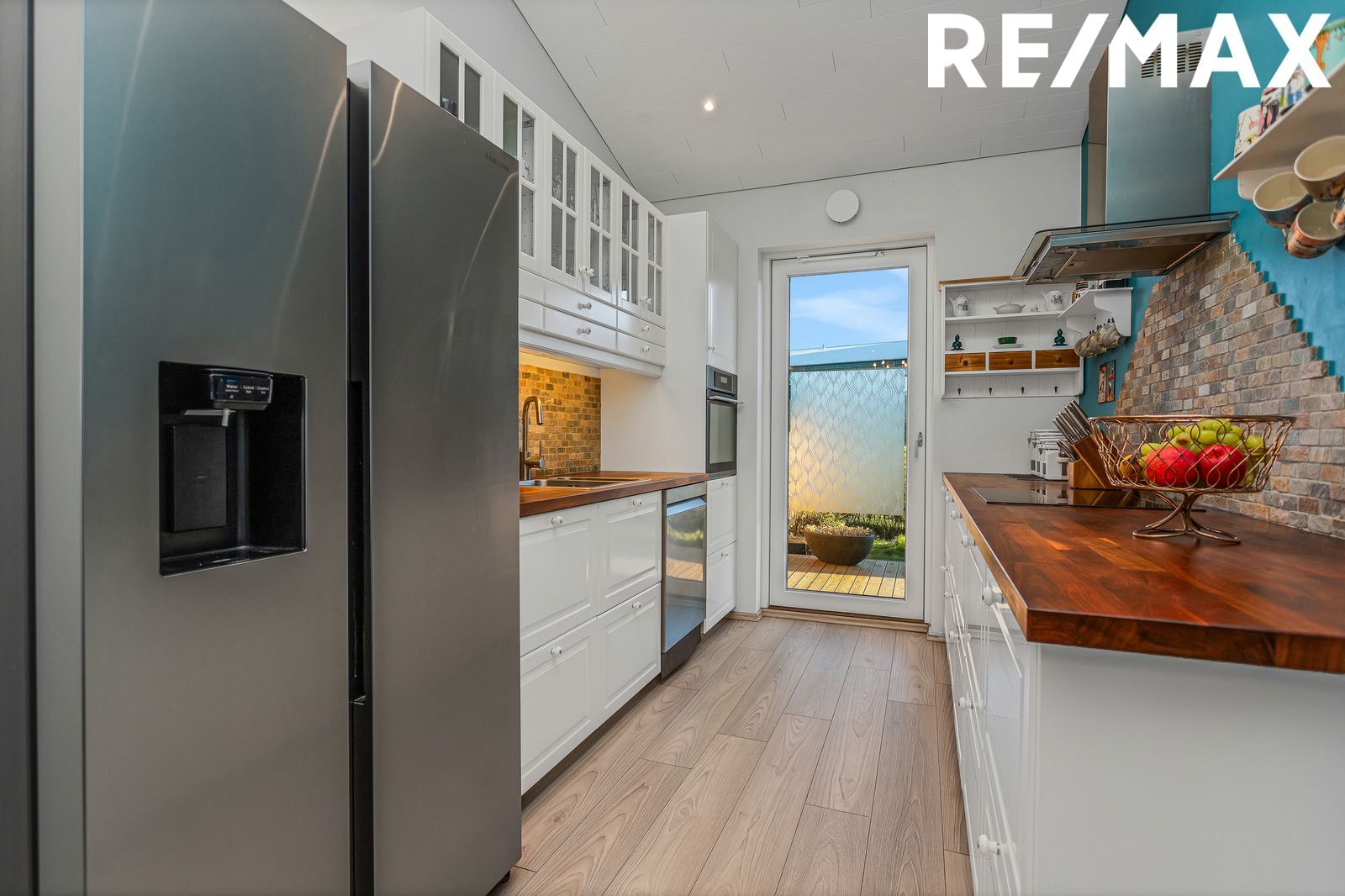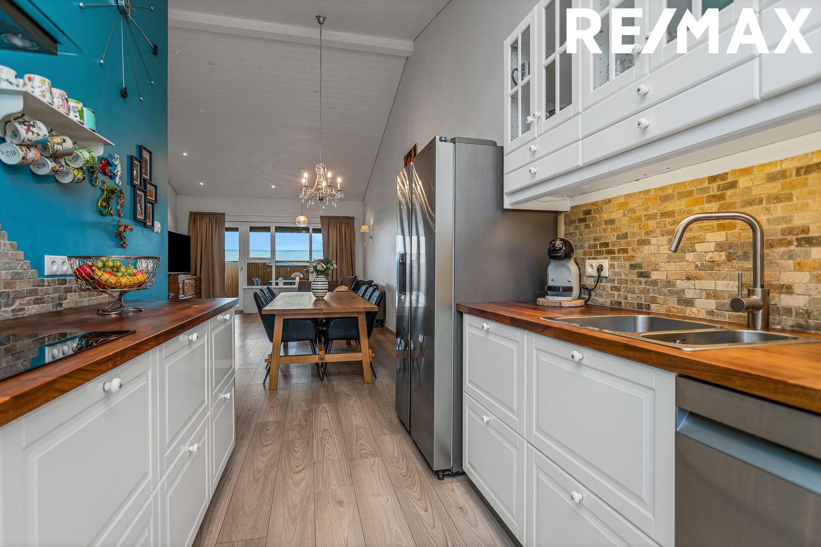 Eldhús er opið til borðstofu og stofu, með fallegum hvítum innréttingum og viðarborðplötu. Flísar á milli skápa. Gott geymslupláss og bökunarofn í vinnuhæð. Úr eldhúsi er útgengt út í
