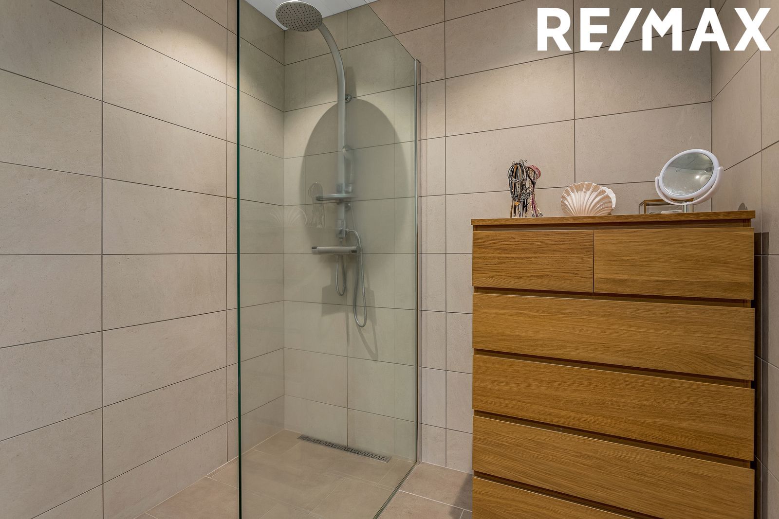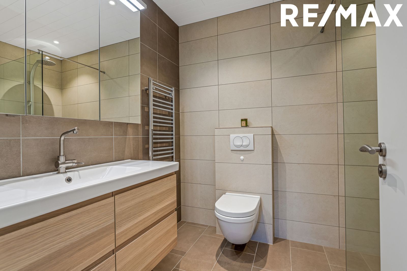 Baðherbergi er mjög fallegt og stílhreint. Vaskinnrétting með góðu geymsluplássi og speglaskáp með lýsingu. Sturta með glerþili, upphengt salerni og handklæðaofn. Flísalagt í hólf og gólf. Tengi er fyrir þvottavél og þurrkara á baðherbergi.