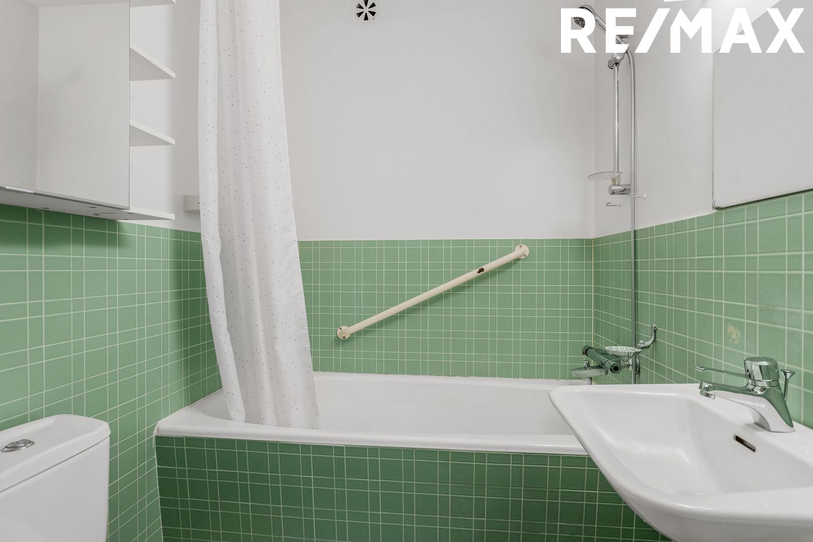 Baðherbergi: Flísar á gólfi og veggjum að hluta, baðkar, salerni, handlaug ásamt spegli.