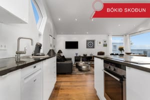 Efri hæðin er einstaklega björt og rúmgóð með aukinni lofthæð. Eldhús, borðstofa og stofa eru í samliggjandi opnu rými, parket á gólfum.