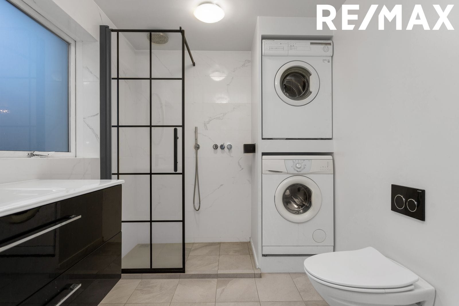 Innrétting og tengi er fyrir þvottavél og þurrkara. Á baðherbergi er góður opnanlegur gluggi og jafnframt