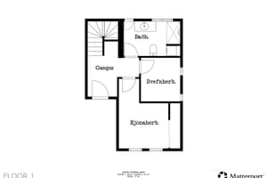 Forstofa er flísalögð og þaðan er gengið inn á 1. hæð hússins sem samanstendur af tveimur svefnherbergjum, baðherbergi og geymslurými undir stiga.
