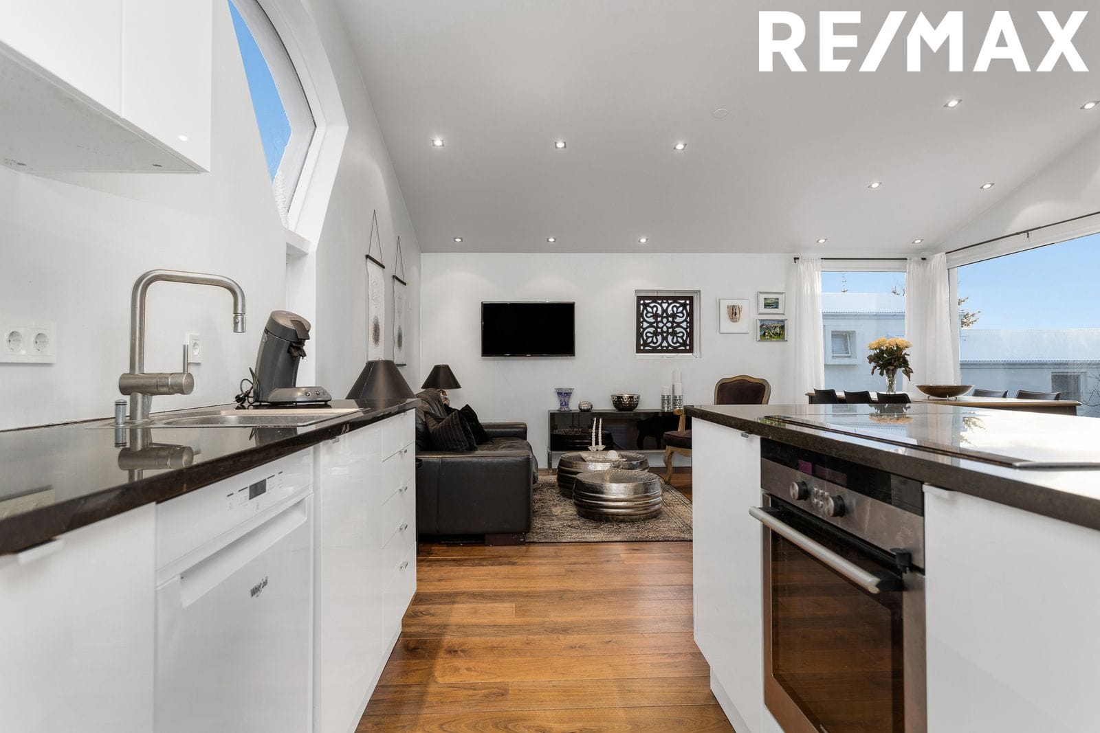Eldhús er með hvítum og stílhreinum innréttingum, svartur steinn á borðum.