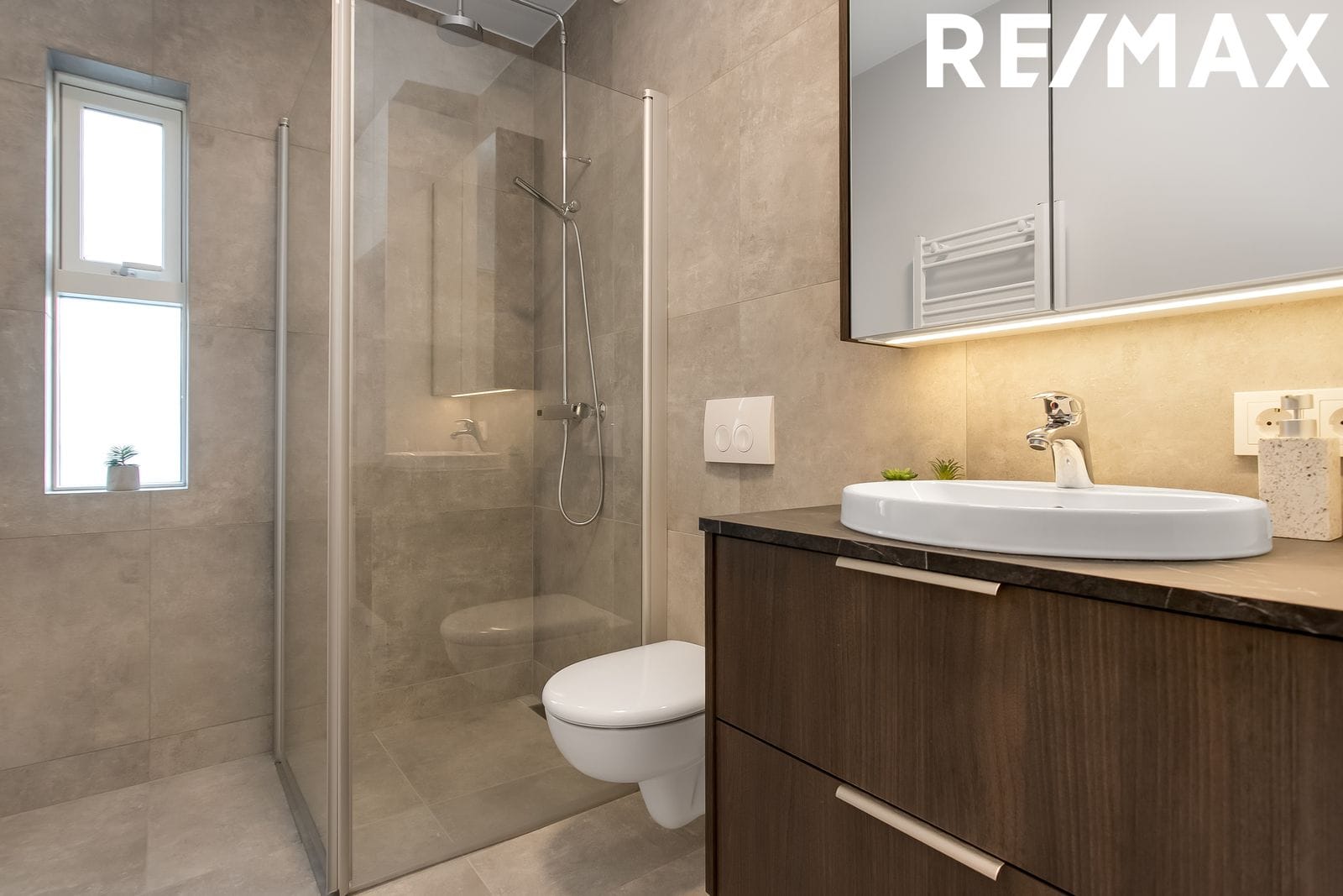 baðherbergi með walk-in sturtu, upphengdu salerni, handklæðaofni og vandaðri innréttingu við og undir handlaug.
