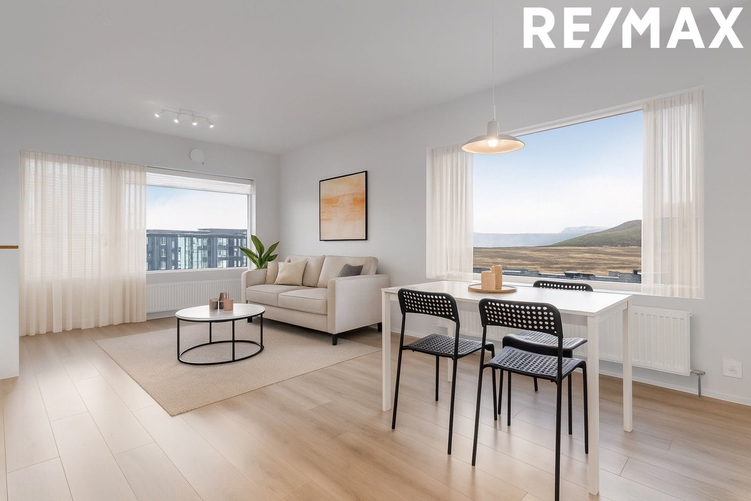 Eldhús, stofa og borðstofa eru í opnu og björtu samliggjandi rými með stórum gluggum til tveggja átta sem gefa eigninni einstaklega góða birtu. Útgengt er úr stofunni á rúmgóðar vestursvalir með fallegu útsýni.