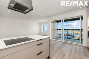 Eldhús/borðstofa: Undir efri skápum er innfræst led- lýsing, á borðplötum í er steinn sem heitir Meteor Ice frá S. Helgasyni. Í innréttingunni eru vönduðum tæki af gerðinni AEG frá Ormsson, blástursofn, innbyggð uppþvottavél ásamt innbyggðum kæliskáp með frysti. Á eyju er span helluborð með fallegum háfi yfir. Borðstofan er rúmgóð í opnu og björtu rými með útgangi út á yfirbyggðar svalir.