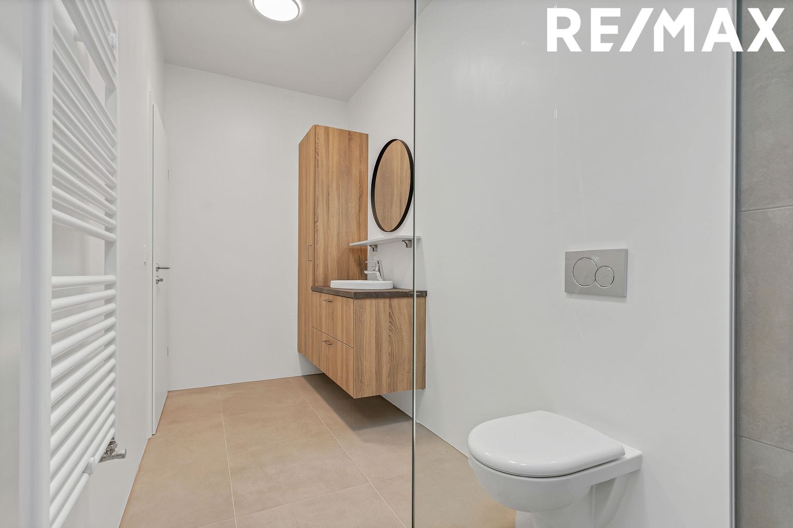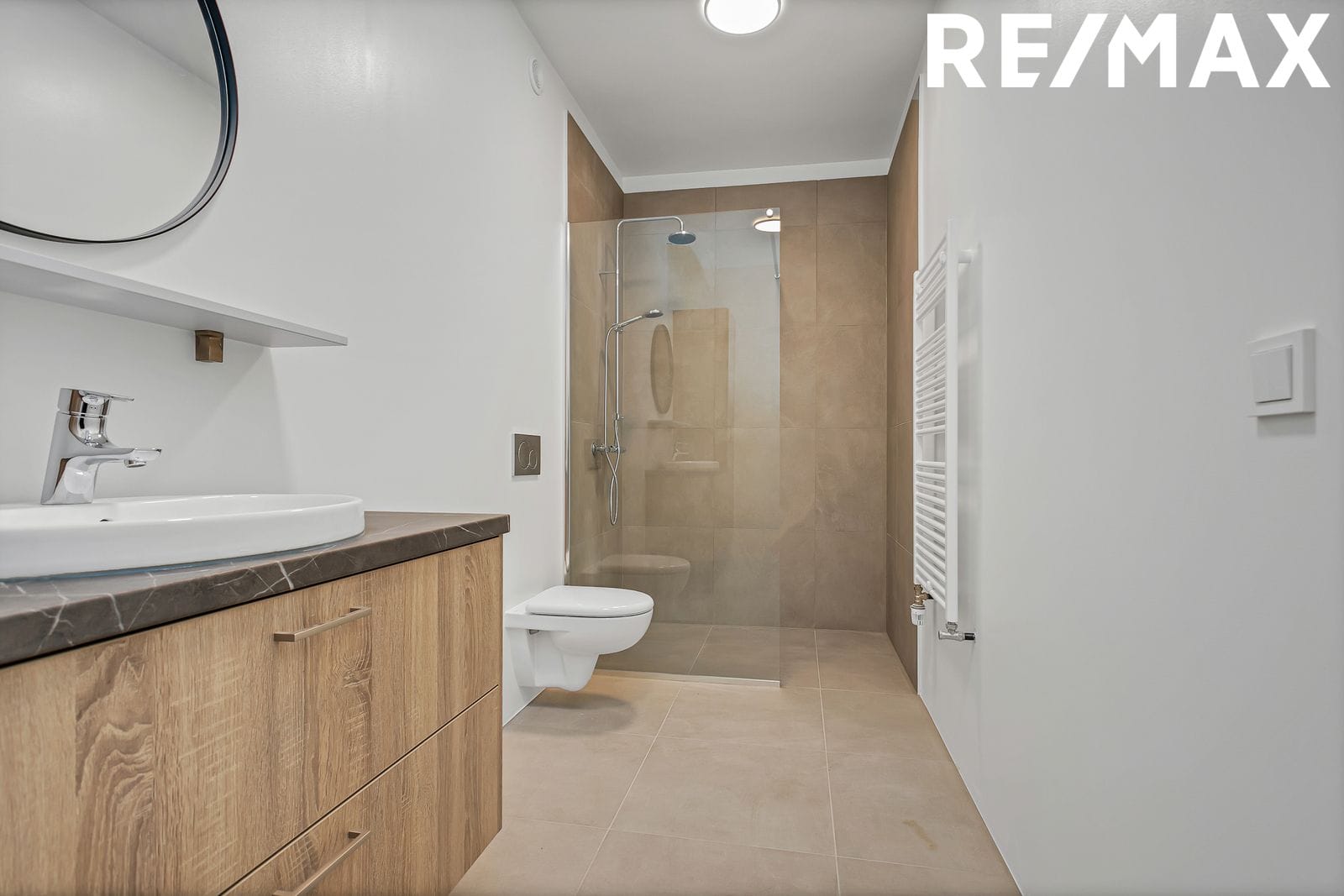Baðherbergi: Flísar á gólfi og veggjum að hluta, innrétting undir og viðhandlaug, upphengt salerni, sturta með hertu glerskilrúmi, handklæðaofn.
