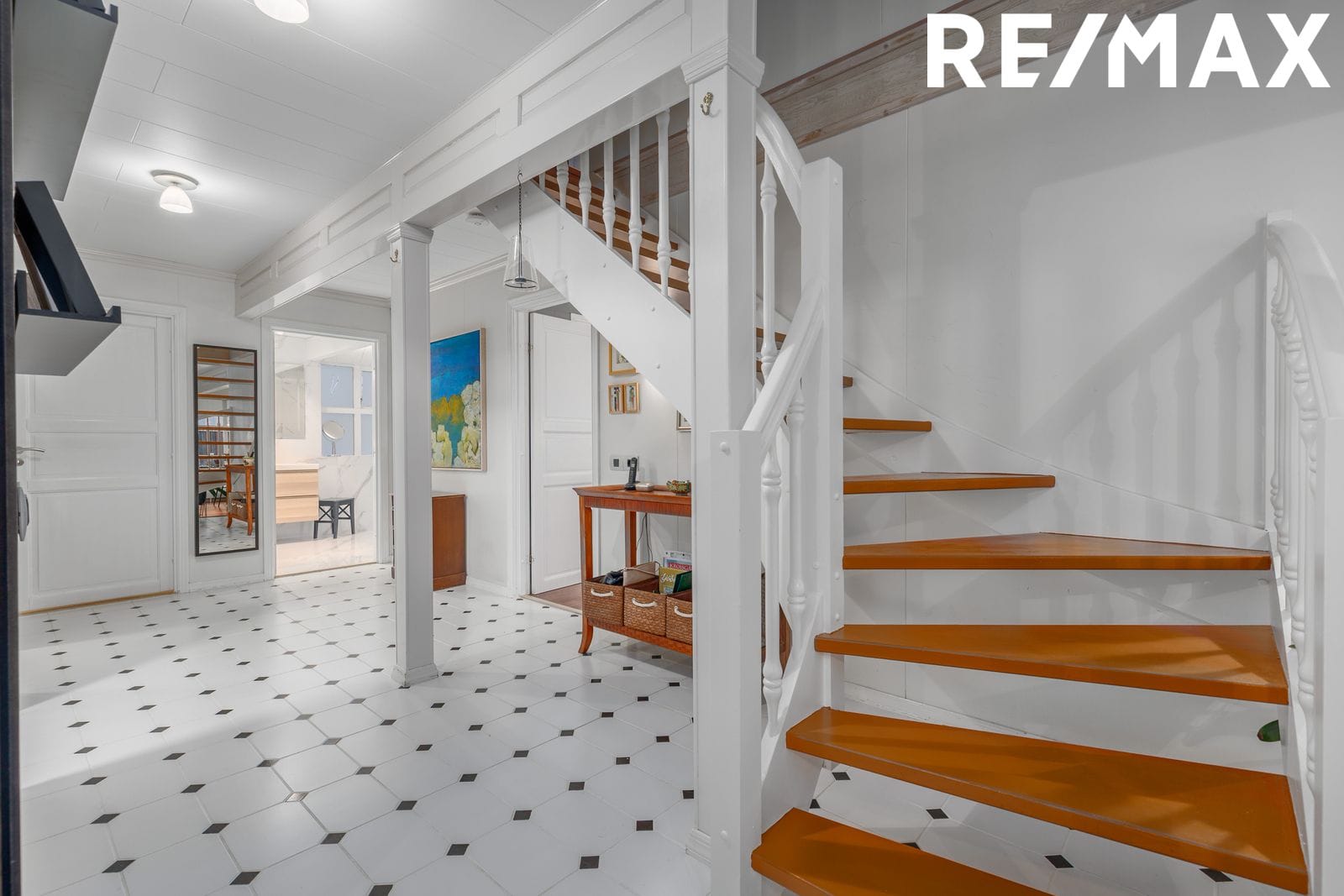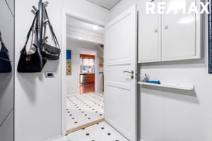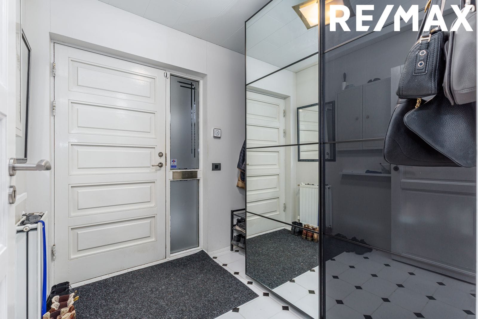 Forstofa: Flísar á gólfi. Fataskápur.