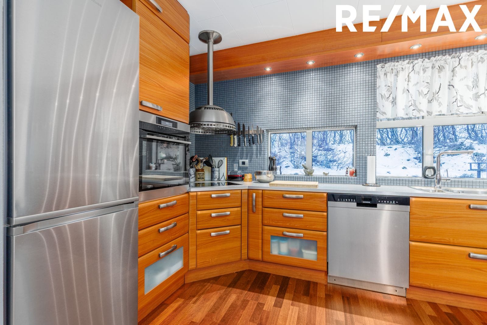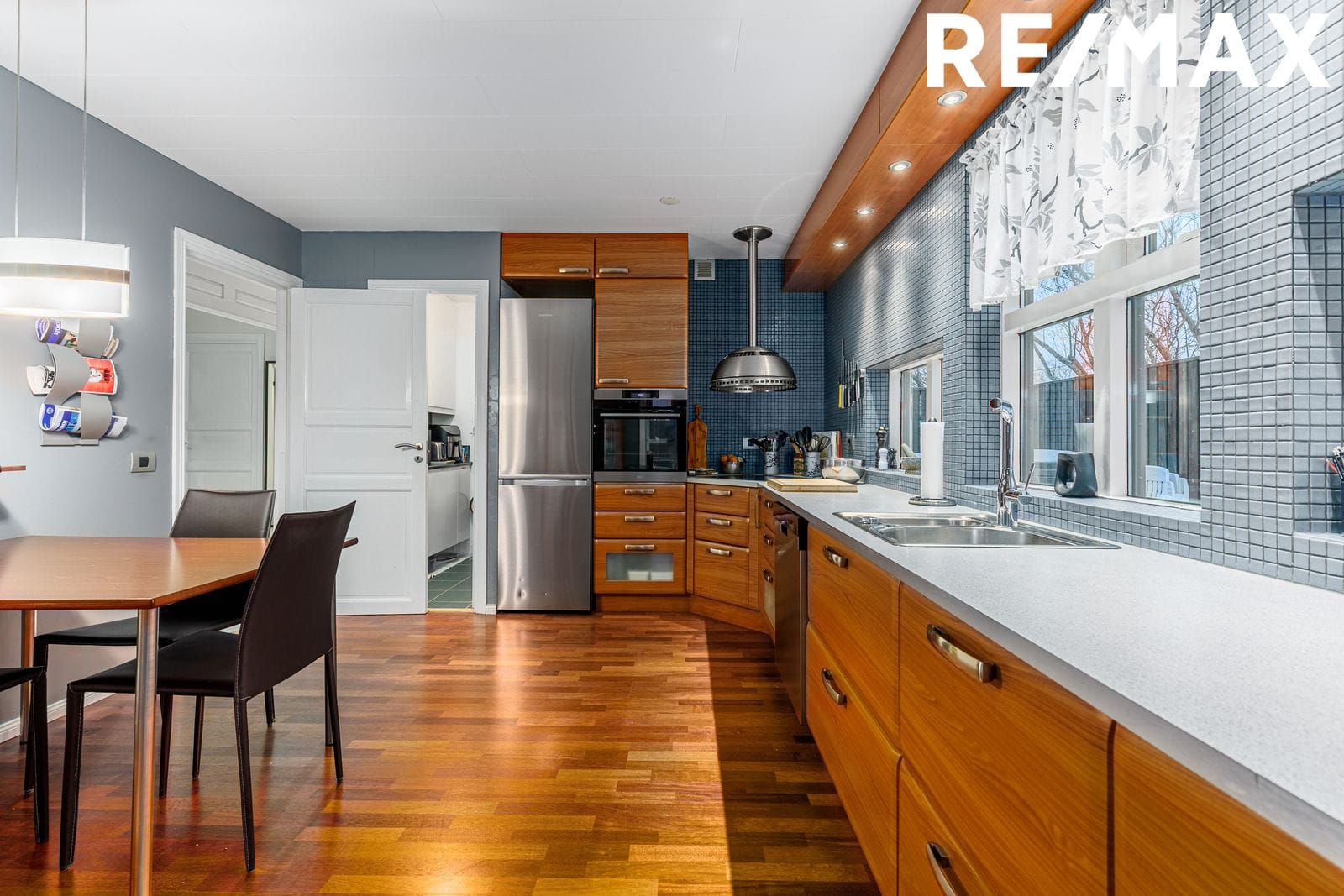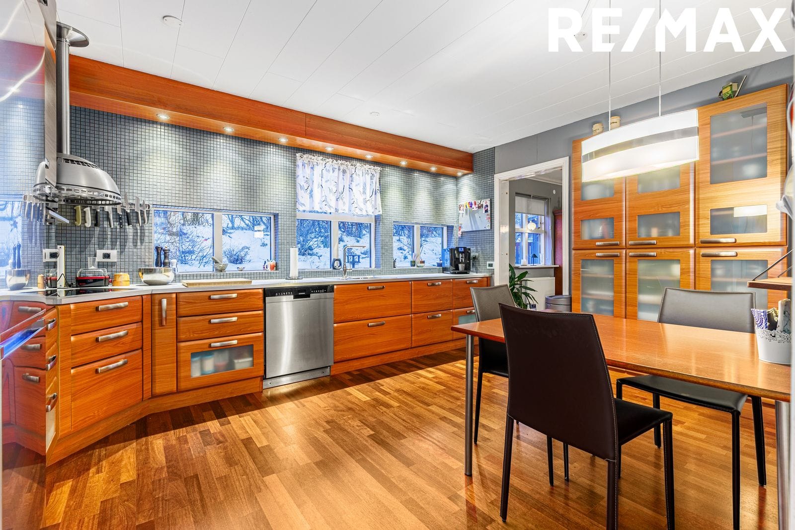 Eldhús: Parket á gólfi. Rúmgóð vönduð innrétting með góðu skápaplássi. Flísalagt með mosaikflísum á milli efri og neðri skápa. Helluborð með háfi yfir. Bakstursofn í vinnuhæð. Búr er inn af eldhúsi og með góðri innréttingu og flísum á gólfi.