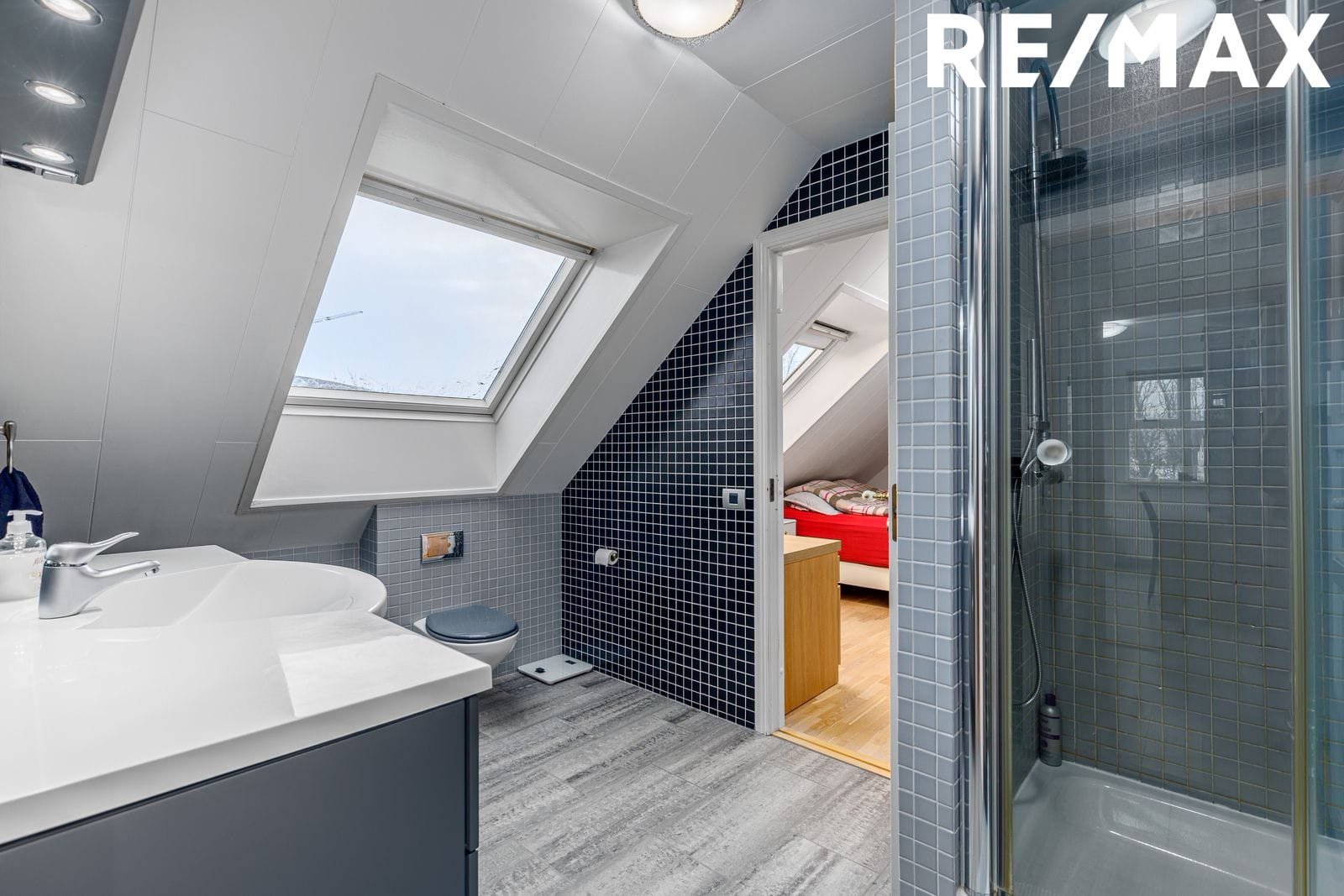 Baðherbergi: Flísalagt í hólf og gólf. Innrétting með handlaug. Sturtuklefi. Upphengt salerni.