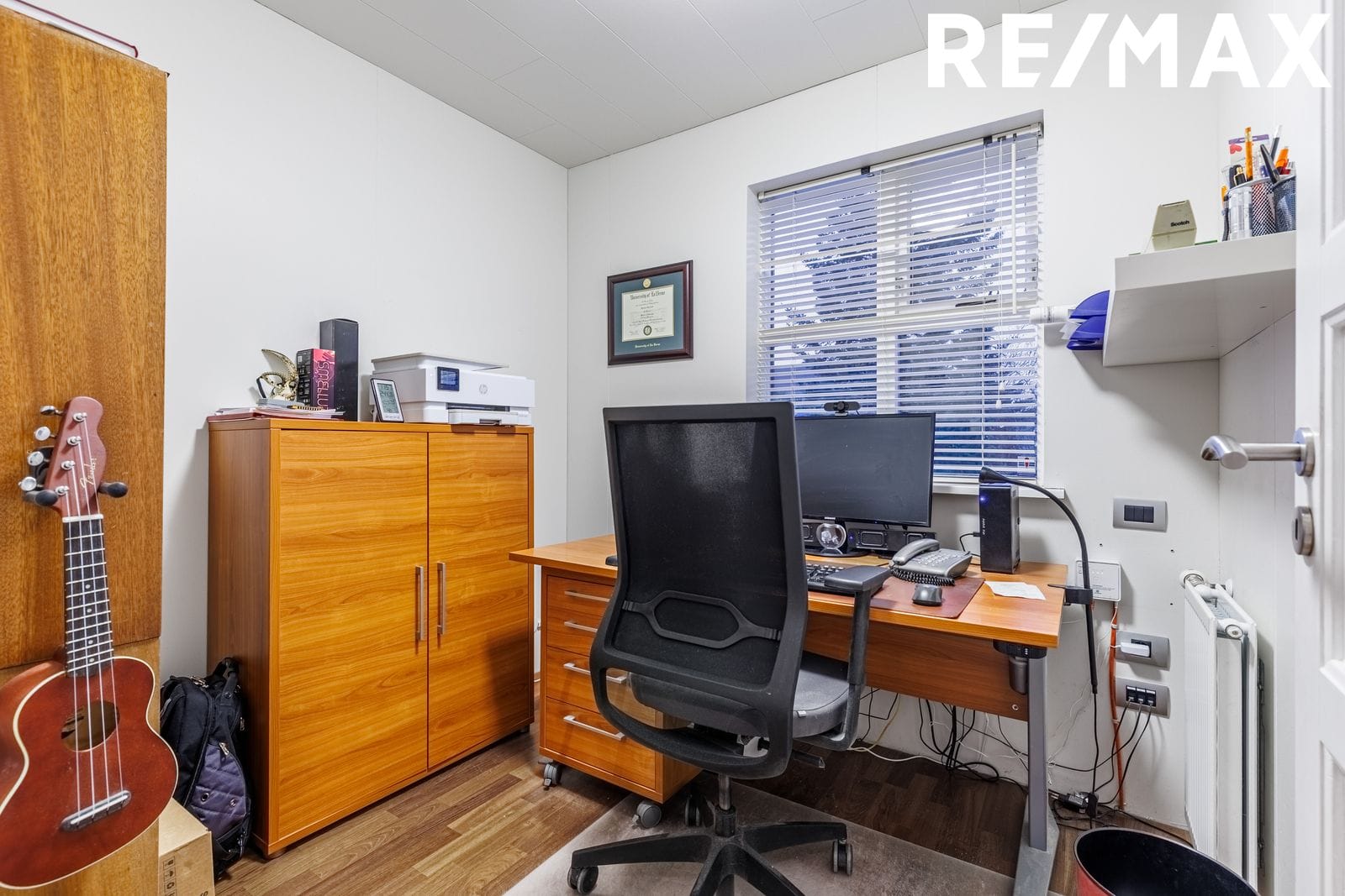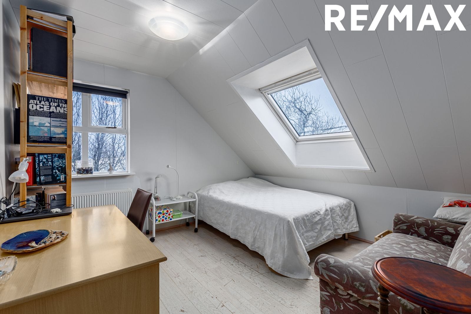 Svefnherbergi: Eitt svefnherbergi er á neðri hæð en það er nýtt í dag sem vinnurými. Parket á gólfi og fataskápur.