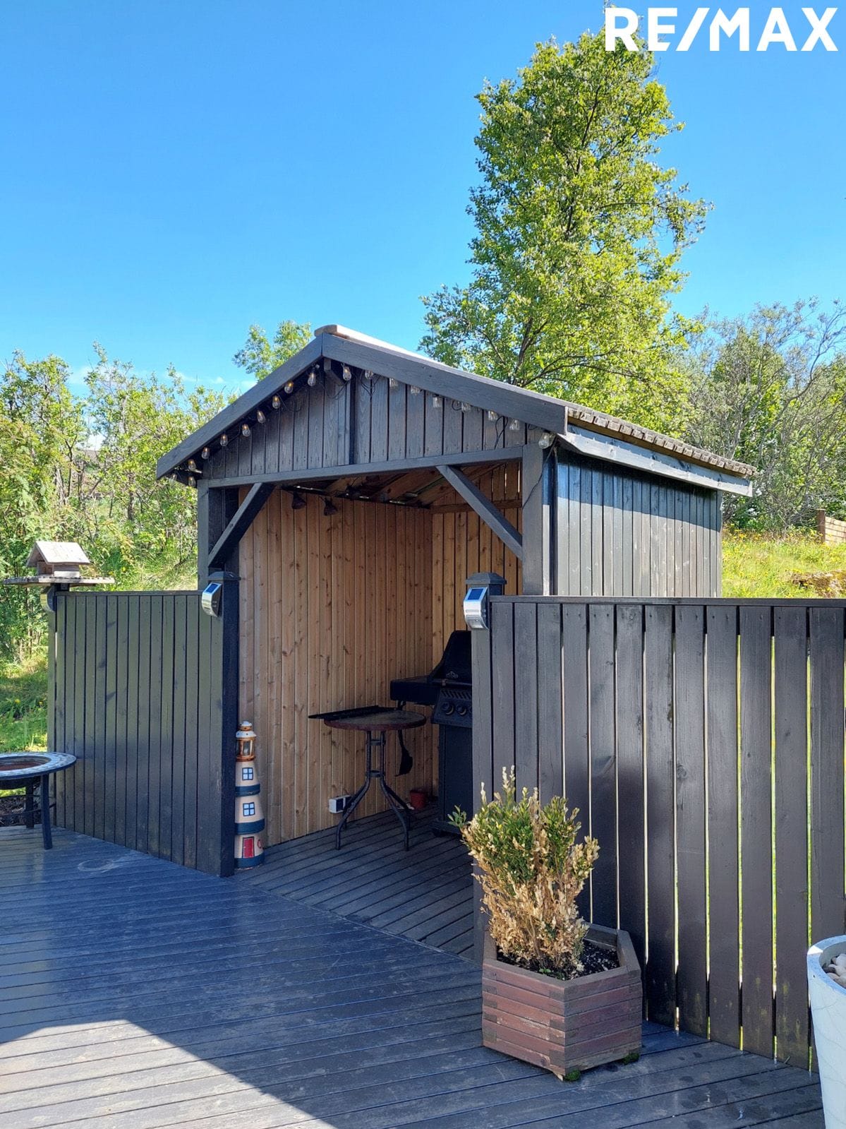 Stofa/Borðstofa: Parket á gólfi. Útgegnt á sólpall með skjólveggjum og útieldhús þar sem byggt hefur verið yfir grillið á smekklegan hátt.