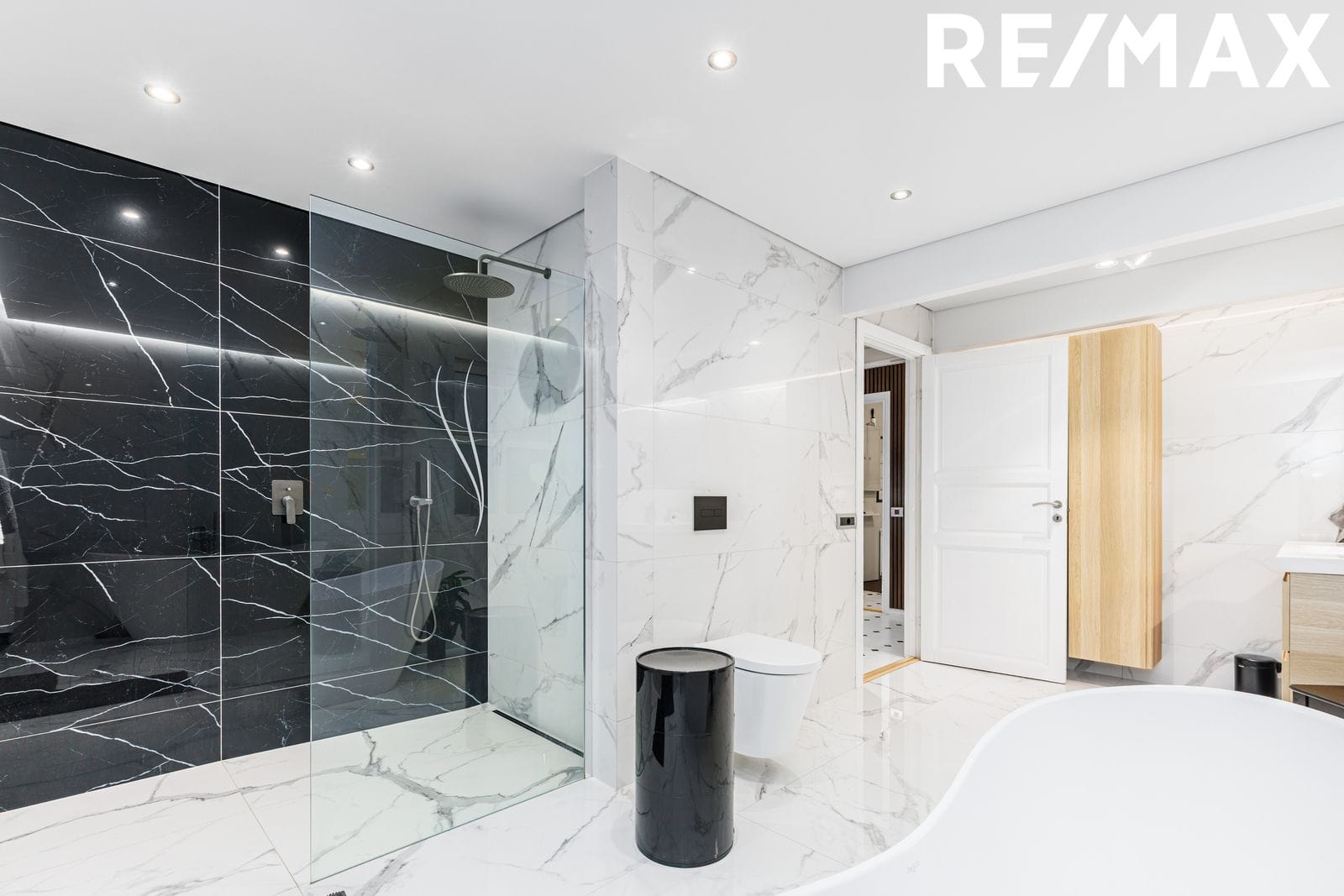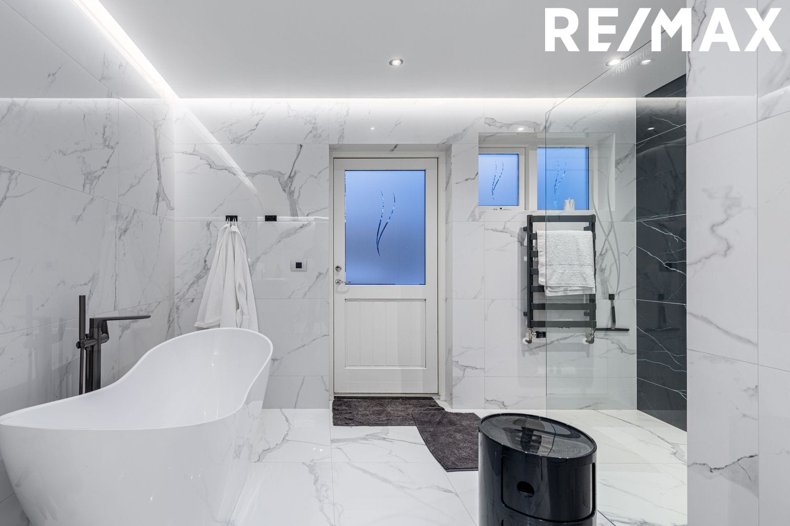 Baðherbergi: Flísalagt í hólf og gólf með fallegum stórum flísum. Inngöngusturta með glerþili. Frístandandi baðkar. Innrétting með handlaug. Innfelld lýsing í lofti. Útgengt á baklóð í heitan pott.