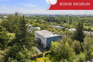 Heildarstærð hússins er því um 402 fm.** SÆKTU SJÁLFVIRKT SÖLUYFIRLIT MEÐ NÁNARI UPPLÝSINGUM HÉR **** SKOÐAÐU EIGNINA Í ÞRÍVÍDD MEÐ ÞVÍ AÐ SMELLA HÉR**Gengið er inn í húsið á miðhæð að ofanverðu. Á miðhæð er mikið rými sem telur anddyri, baðherbergi (klósett og vaskur), stórt eldhús með borðkrók, stór borðstofa/stofa með útgengi út á stórar suðursvalir, stofa með arinn og tvö herbergi.