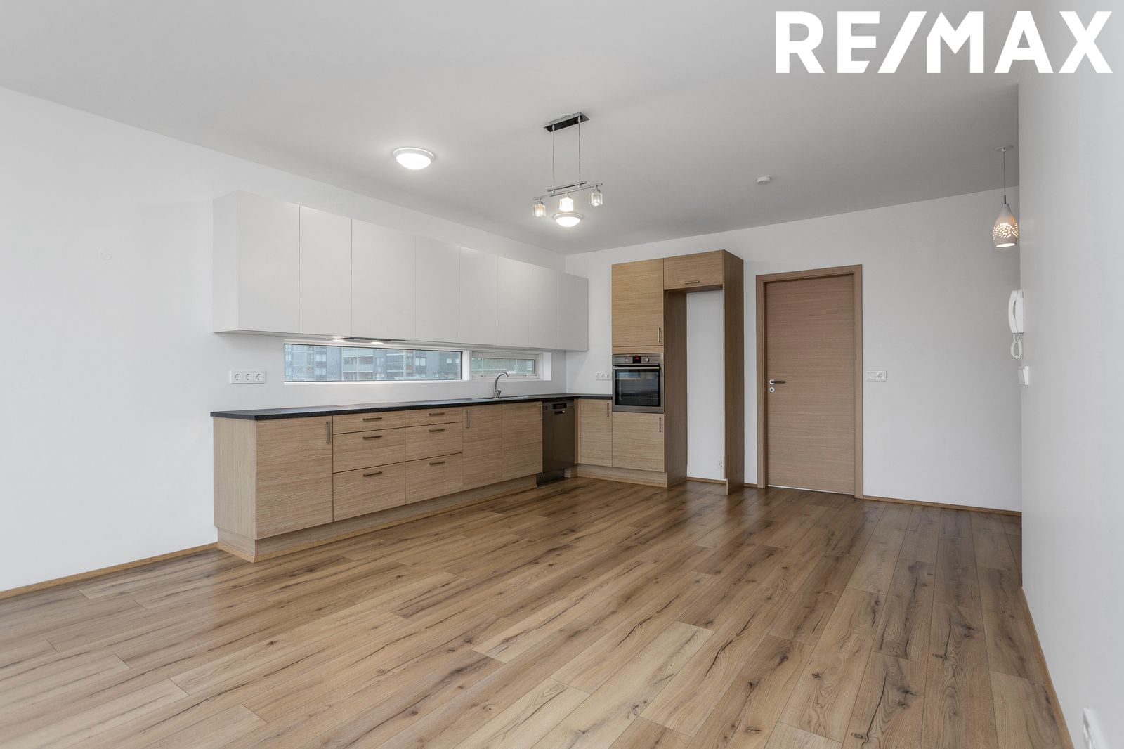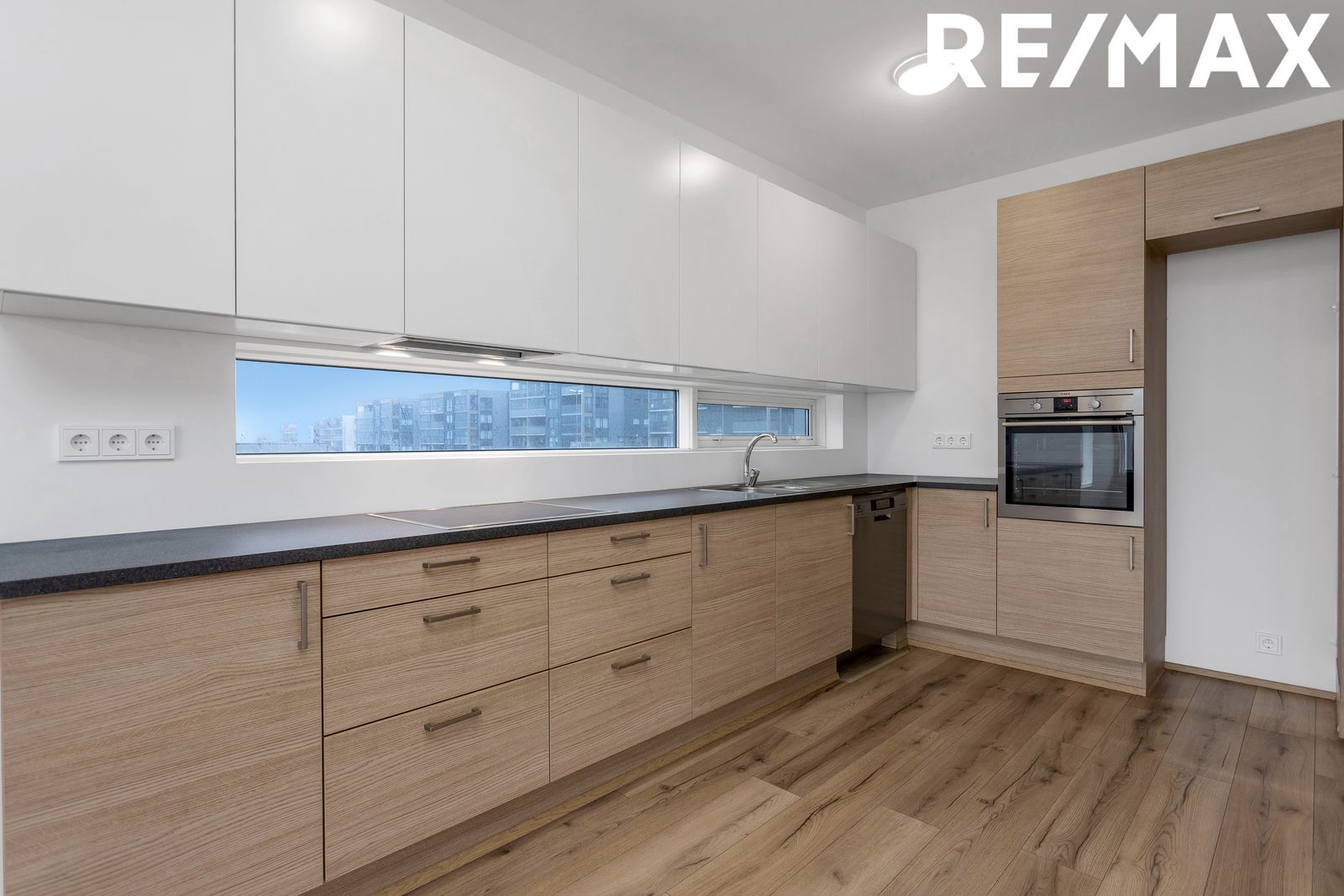 Eldhús er með fallegri L-laga innréttingu frá HTH. Í innréttingu er helluborð, vifta og ofn í vinnuhæð.