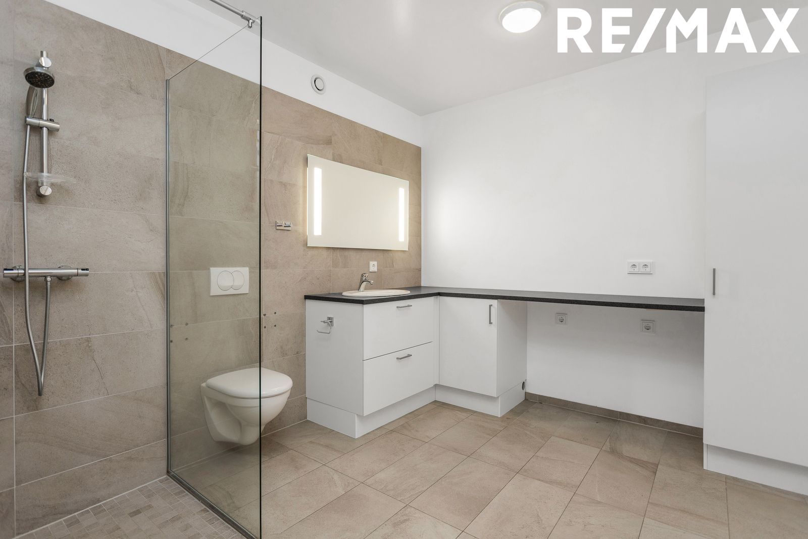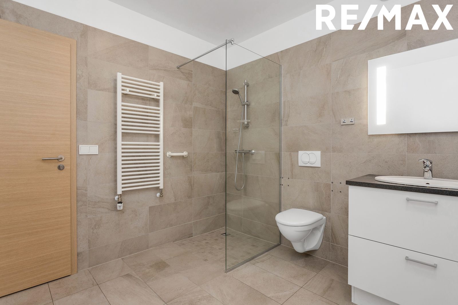 með fallegri innréttingu, spegill með innbyggðri lýsingu. Handklæðaofn, upphengt salerni og sturta. Flísar á gólfum og vegg að hluta. Einnig er góð innrétting fyrir þvottavél og þurkara með góðu skápaplássi. Innréttingar eru frá HTH.