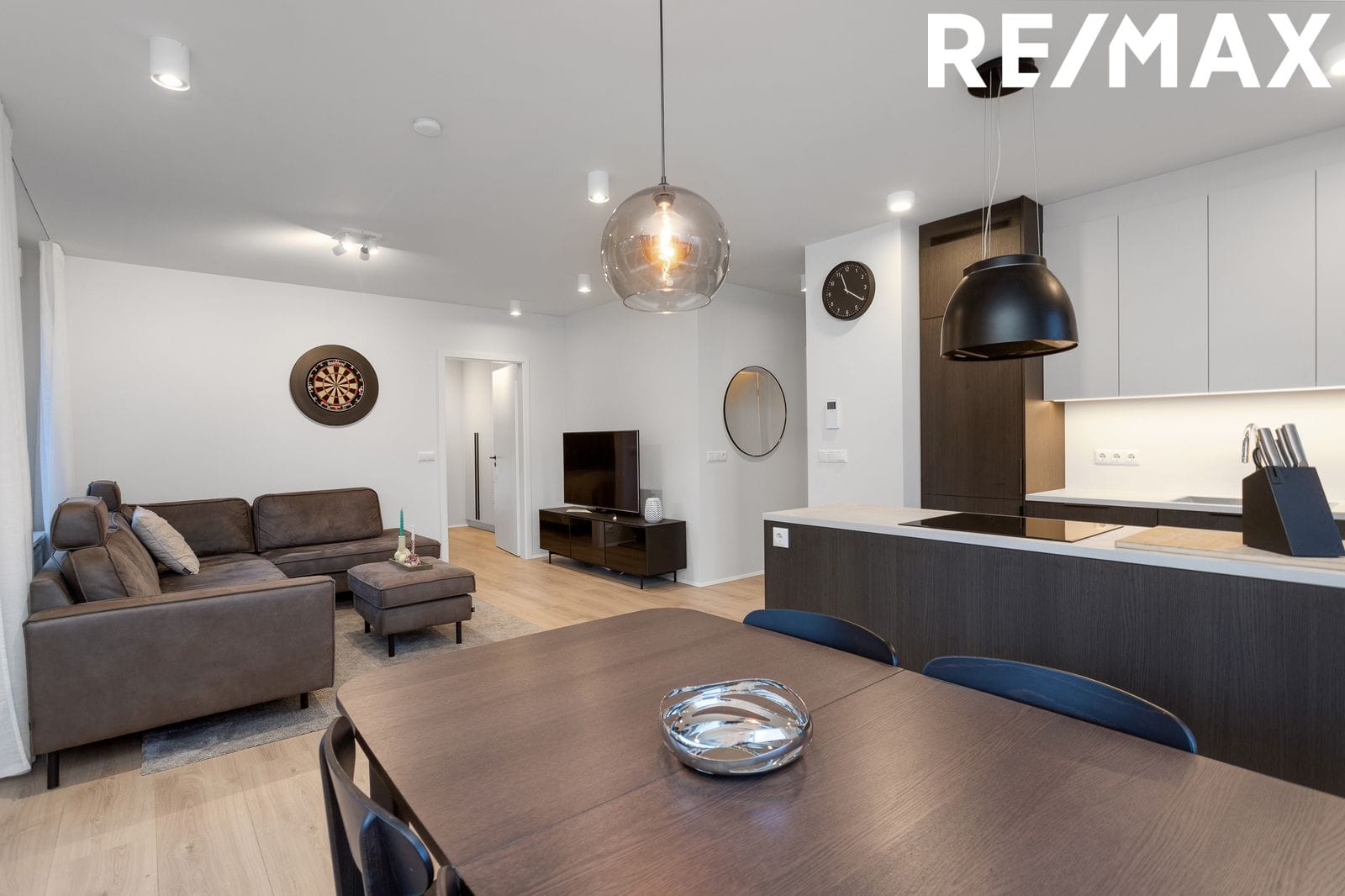 Stofa/eldhús og borðstofa er í opnu og fallegu rými með útgengi út á rúmgóðan viðarpall.