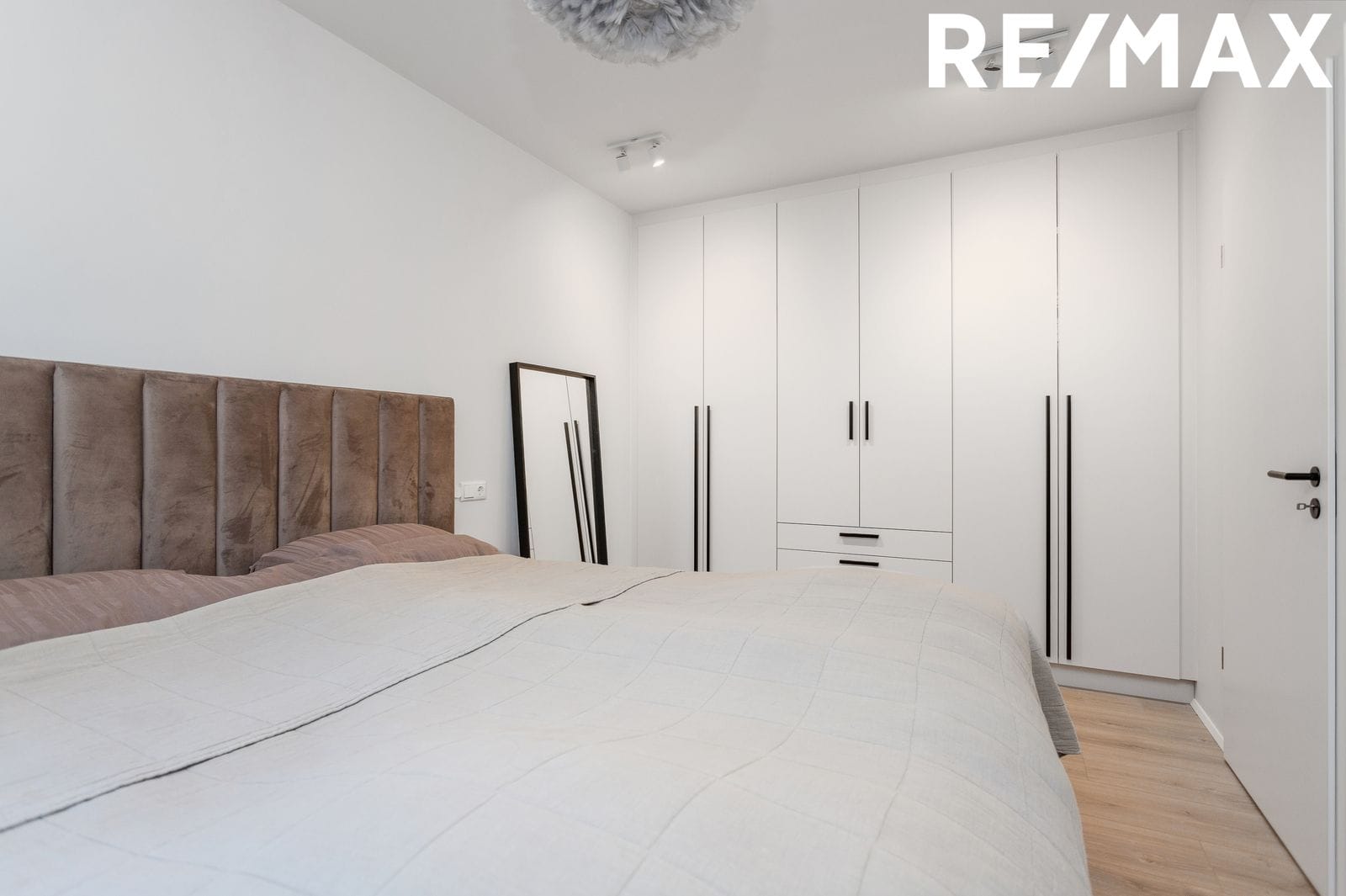 Svefnherbergi: Rúmgott er með góðum skápum, parket á gólfi.