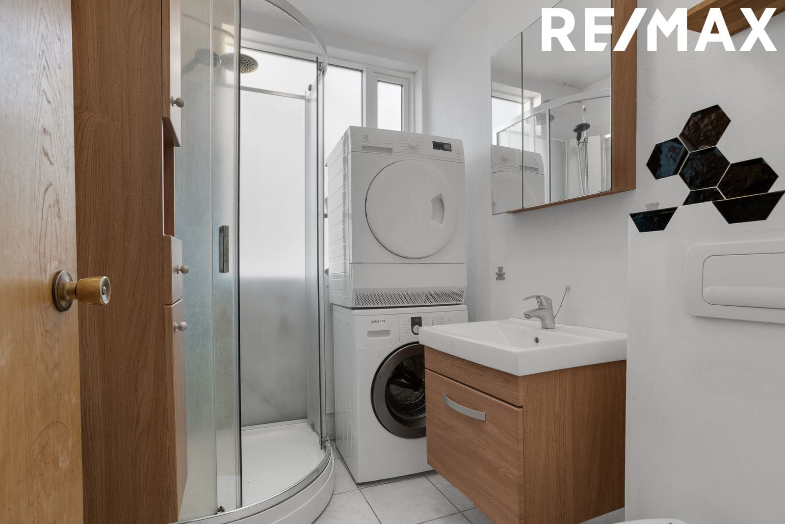 Baðherbergið er ljósum flísum á gólfi, vegghengt klósett og snyrtileg innrétting með speglaskáp. Sturtuklefi ásamt handklæðofni. Tengi er fyrir þvottél og þurrkara inni á baði.
