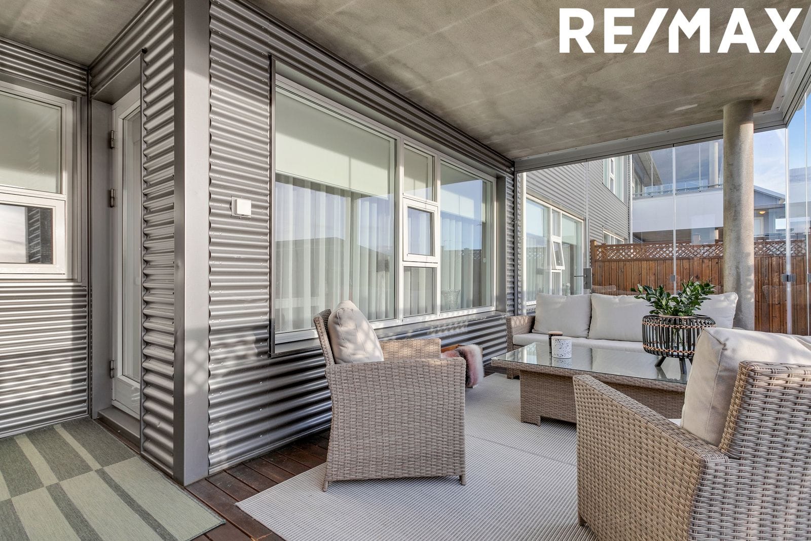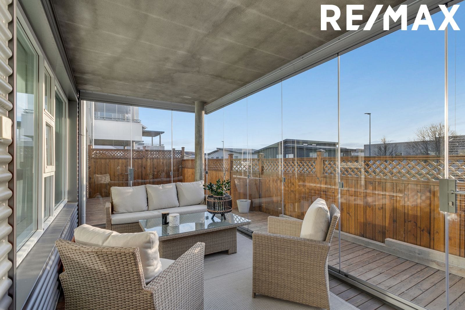 Íbúðin er með sérverönd með timbur skjólveggjum ásamt svalalokun Smelltu á linkinn til að skoða íbúðina í 3D