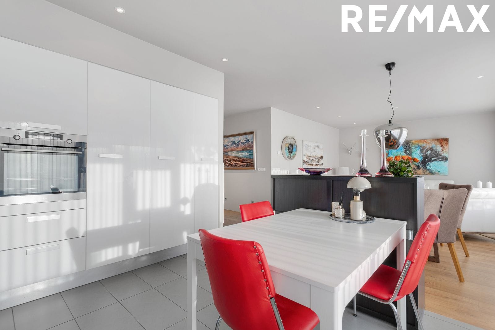 Stofa/borðstofa: Parket á gólfí, björt og rúmgóð með stórum gluggum og útengi út á rúmgóða timburverönd í sólaráttir.