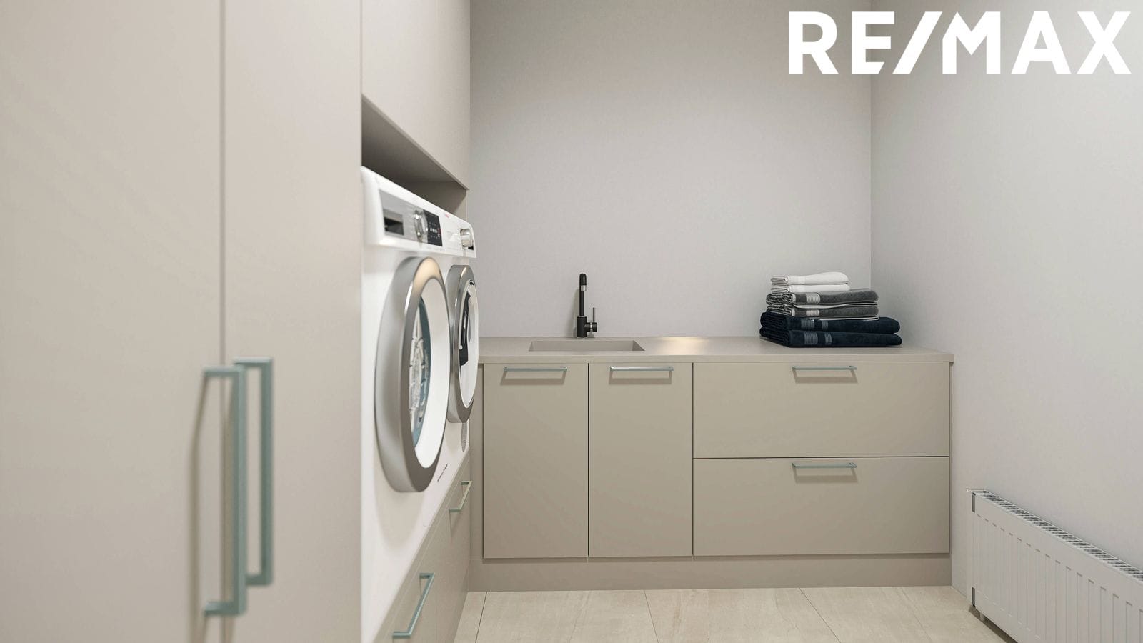 Sér þvottahús innan íbúðar með veglegri innréttingu. Sér