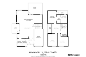 79,8 fm, gólfflötur stærri en uppgefnir fermetrar vegna súðar.Staðsteyptur stigi er á milli hæða með glerhandriði.