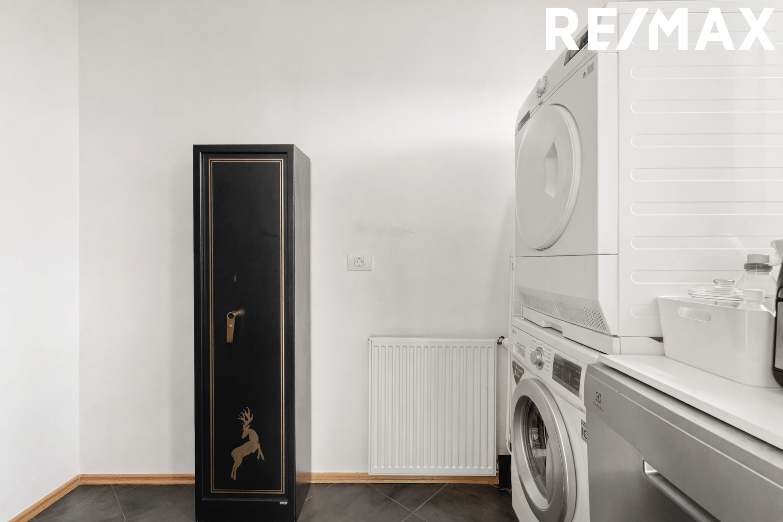 Þvottahús/búr: Er inn af eldhúsi með tengi fyrir þvottavél, þurrkara og uppþvottavél, gluggi er með opnanlegu fagi. Flísar á gólfi.