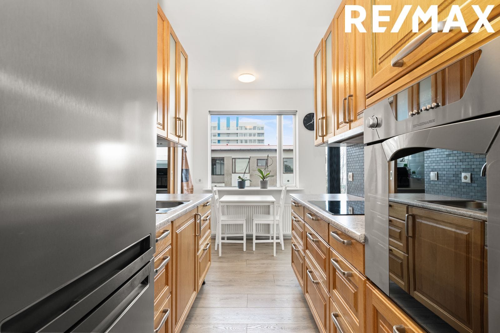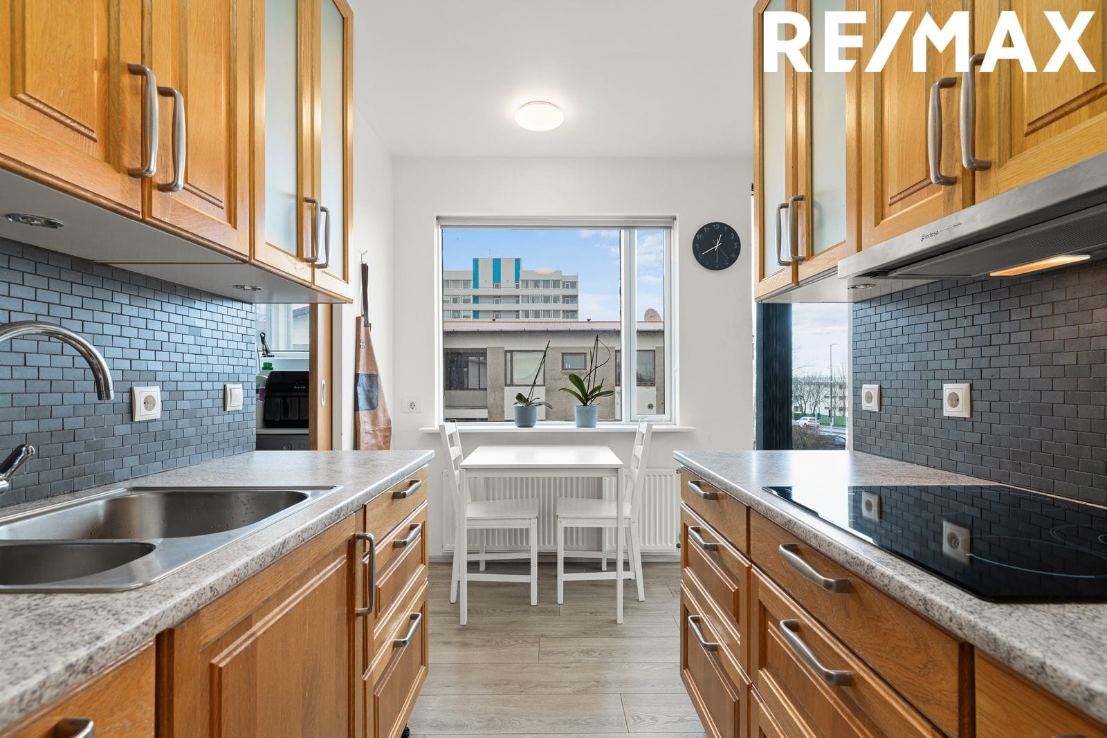 Eldhús: Er bjart með borðkróki, góðu skúffu- og skápaplássi ásamt bakaraofni í vinnuhæð. Harðparket á gólfi.