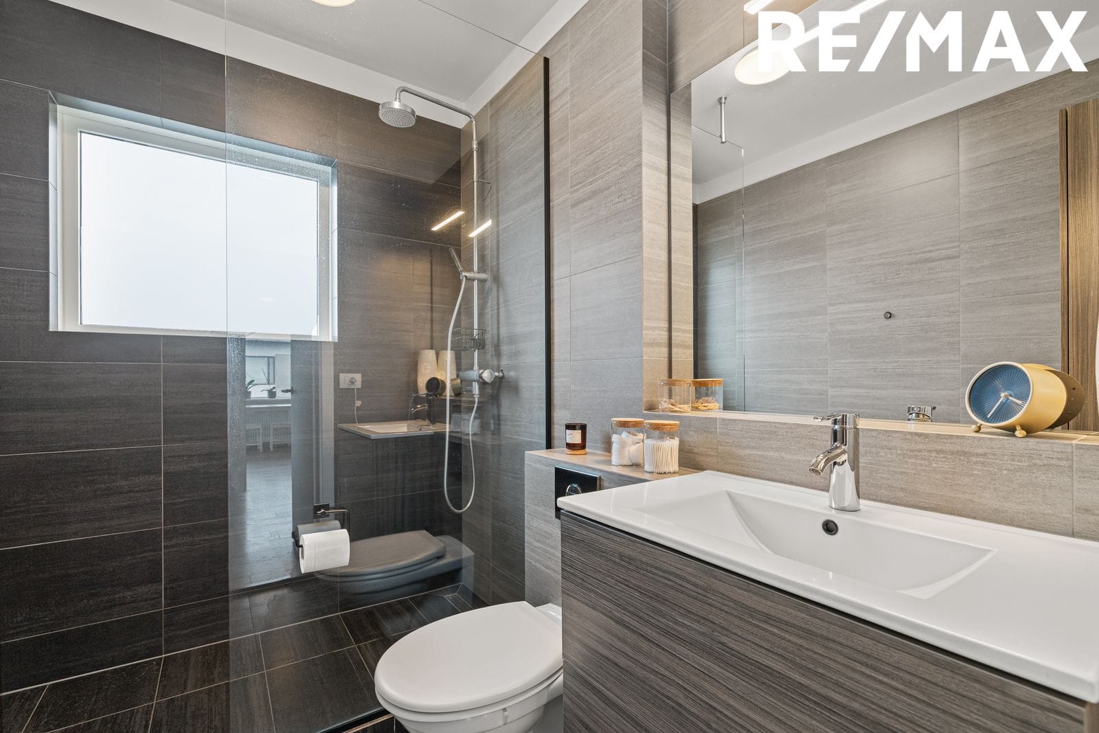 Baðherbergi: Er flísalagt í hólf og gólf með upphengdu salerni, þreplausri sturtu með glervegg, vask með skúffum undir ásamt stórum spegli (lagnir eru til staða fyrir handklæðaofn). Gluggi er með opnanlegu fagi.