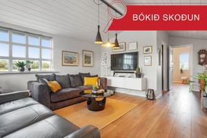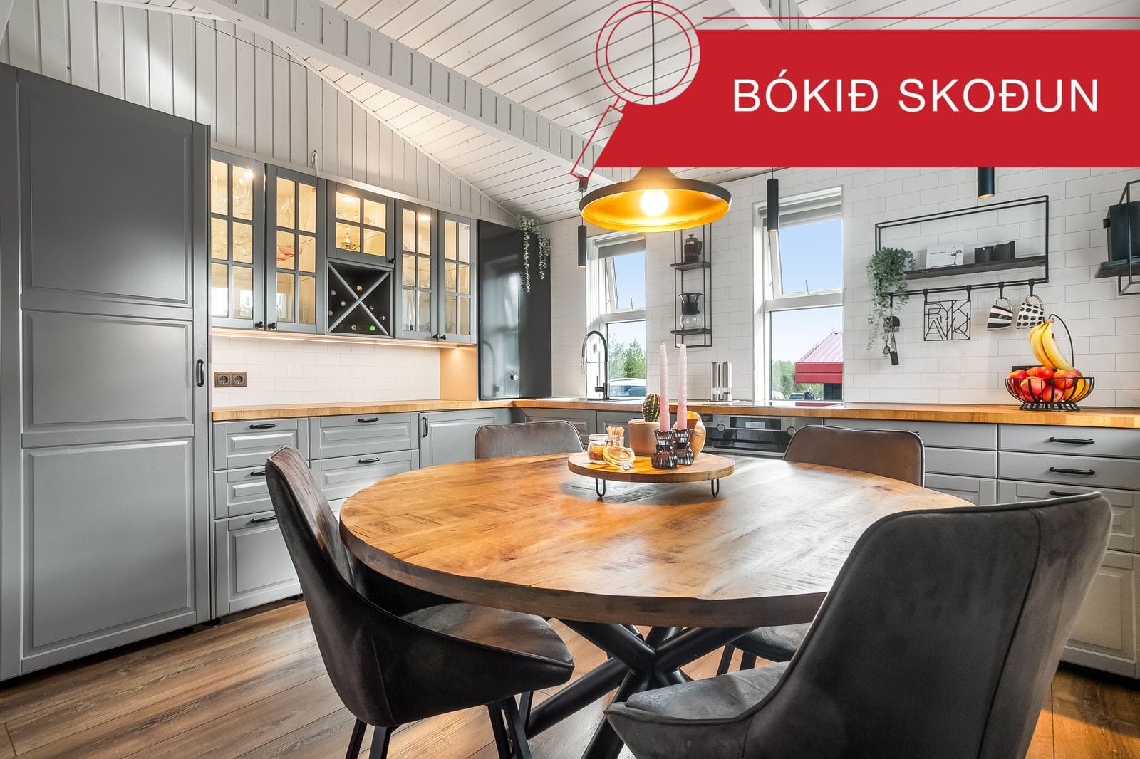 **SÆKTU SÖLUYFIRLIT SJÁLFVIRKT HÉR** **SKOÐAÐU EIGNINA Í ÞRÍVÍÐRI SÝN MEÐ OG ÁN HÚSGAGNA** (ýtir á takkann niðri í vinstra horni þar sem er stóll með / merki yfir)Núverandi skipulag eignar: Gangur, eldhús, stofa, þrjú svefnherbergi, baðherbergi, þvottahús/geymsla, upphitaður geymsluskúr, gróðurhús og kaldur geymsluskúr