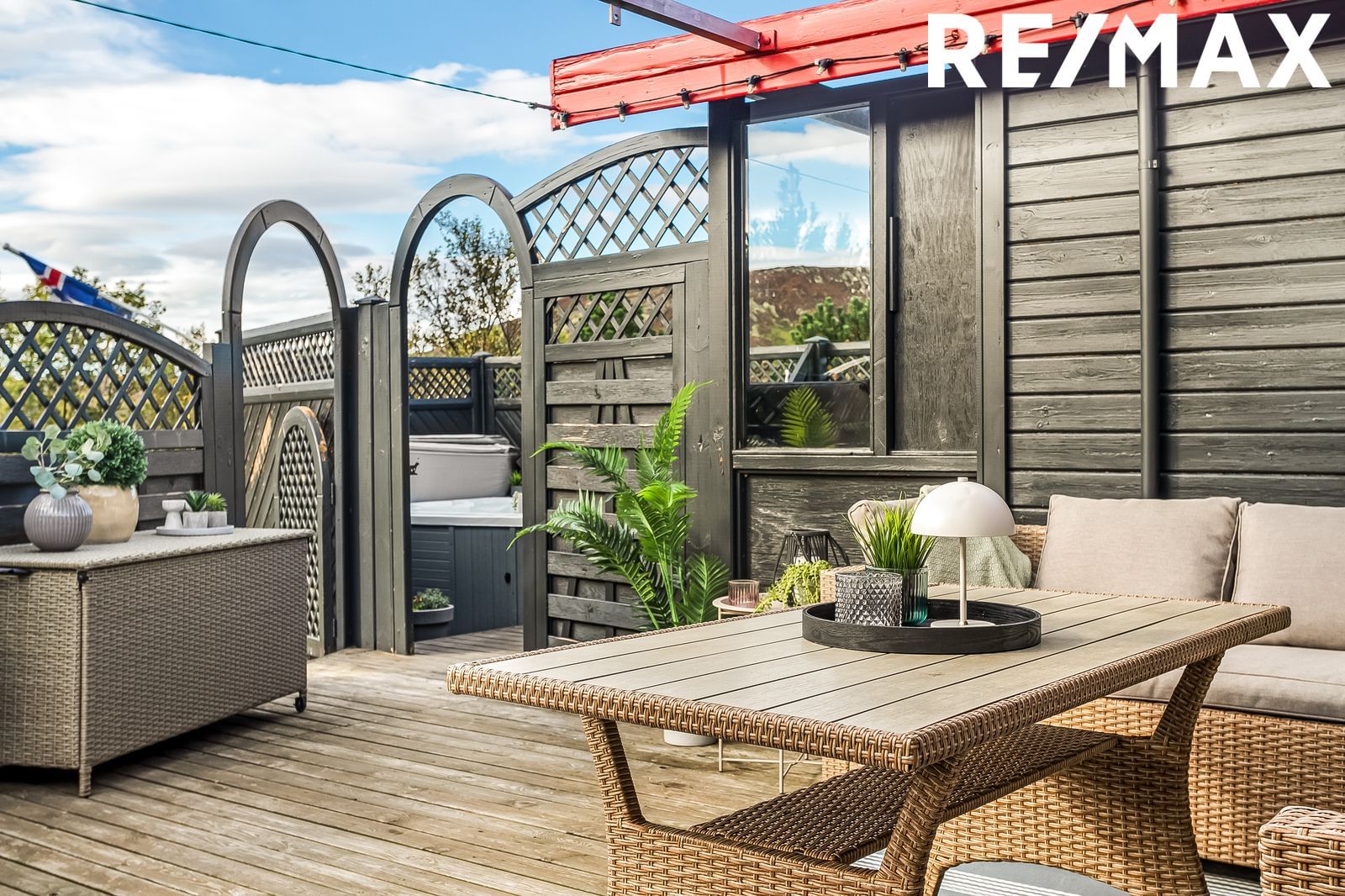Verönd: Góð viðarverönd er við húsið. Fyrir framan stofuna er aflokuð sólarverönd með nýlegumheitur rafmagnspottur með nuddi og síðan er verönd alveg meðfram 2 hliðum hússins.