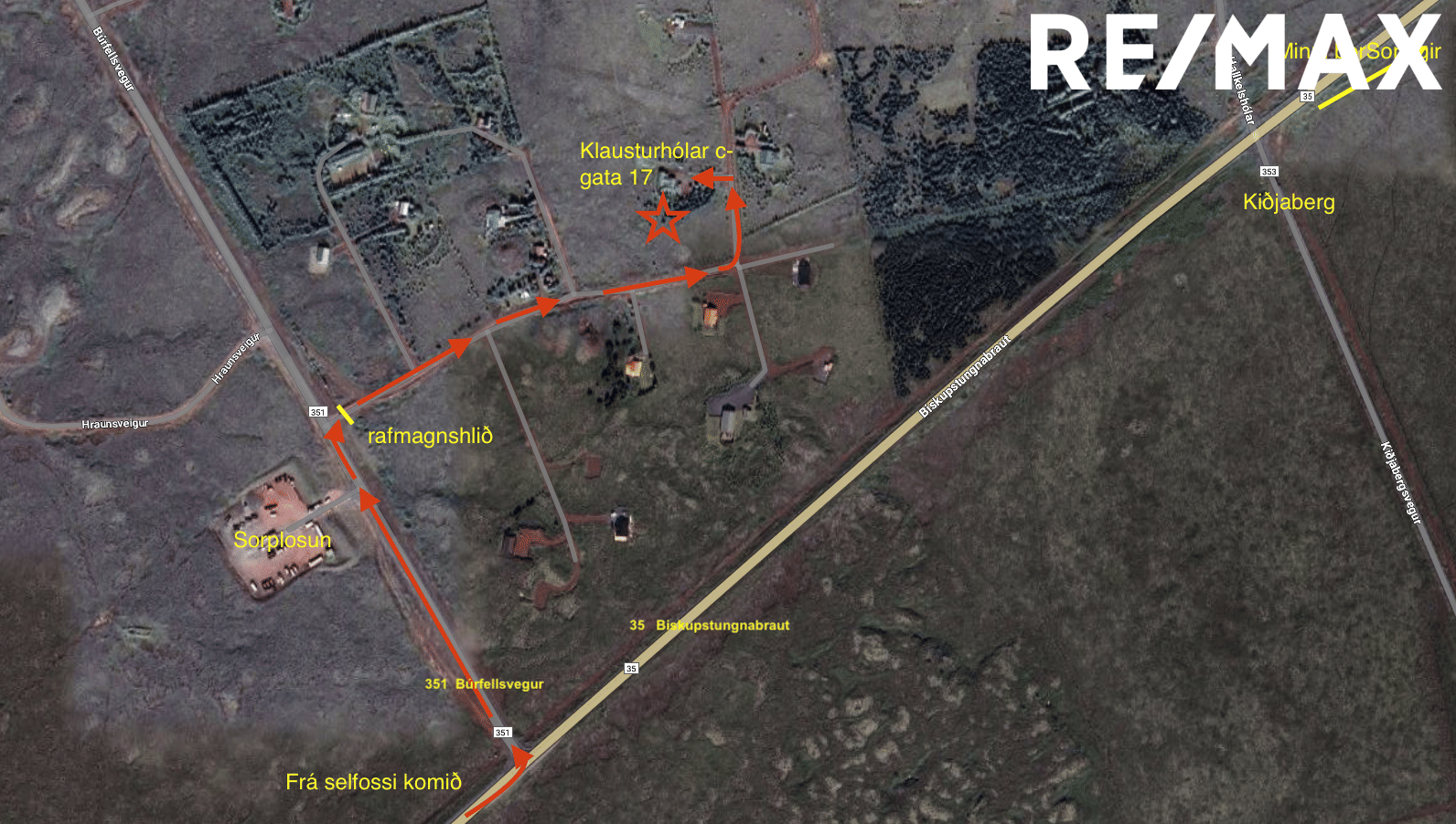 Vegvísir að húsinu: Frá Reykjavík/ Selfossi komið akið veg 35 Biskupsstungnabraut að Búrfellsvegi nr 351 til vinstri og beygið inn á þann veg. Akið fram hjá gámasorpalosunarstöð á vinstri hönd, beygið svo til hægri á fyrsta afleggjara. Þar er rafmagnshlið og fylgið leiðbeiningum þar.