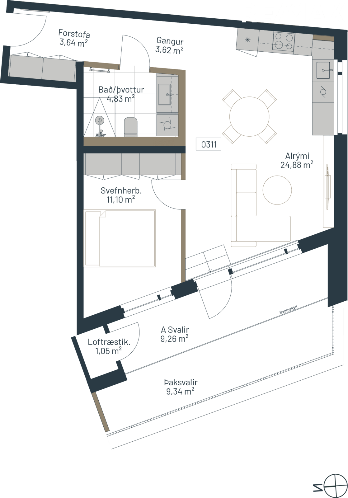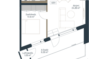 Íbúð 311: Vel skipulögð og björt 65,3 fm tveggja herbergja íbúð á þriðju hæð, tvískiptar svalir sem eru í sitthvoru lagi 9,3 fm og skiptist með svalalokun. Bílastæði fylgir eigninni í bílakjallara og 5,2 geymsla í sameign.