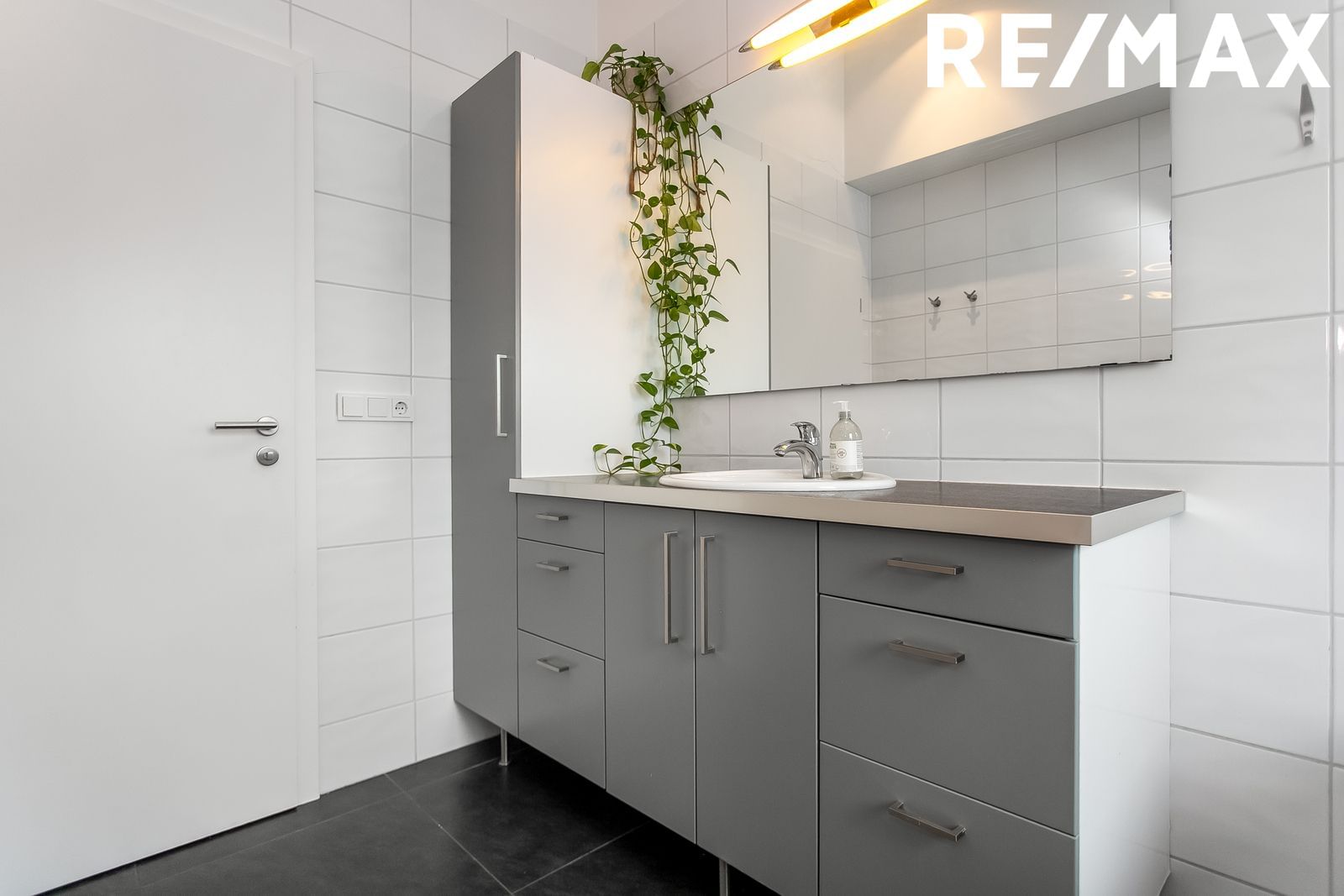 Þvottahús: Flísar á gólfi. Góð innrétting með vinnuborði og efri skápum. Innrétting undir þvottavél og þurrkara. Gluggi í rýminu.