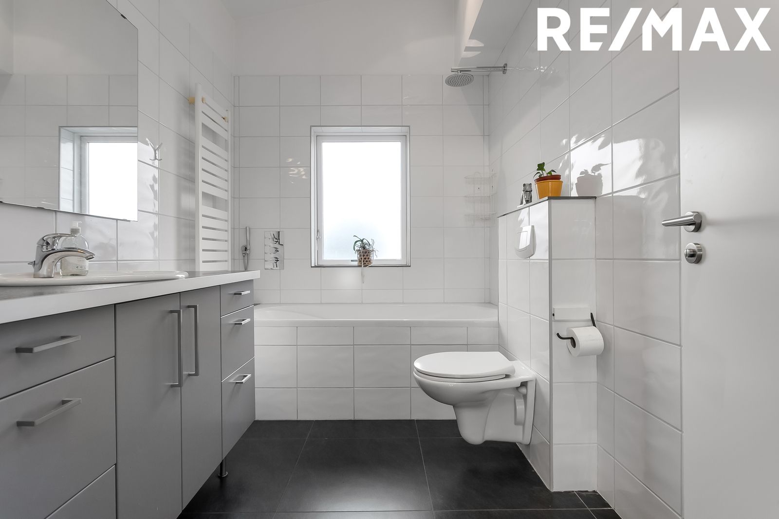 Baðherbergi: Flísar á gólfi og veggjum. Hvít baðinnrétting, upphengt salerni og sturtuklefi. Gluggi í rýminu.
