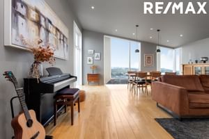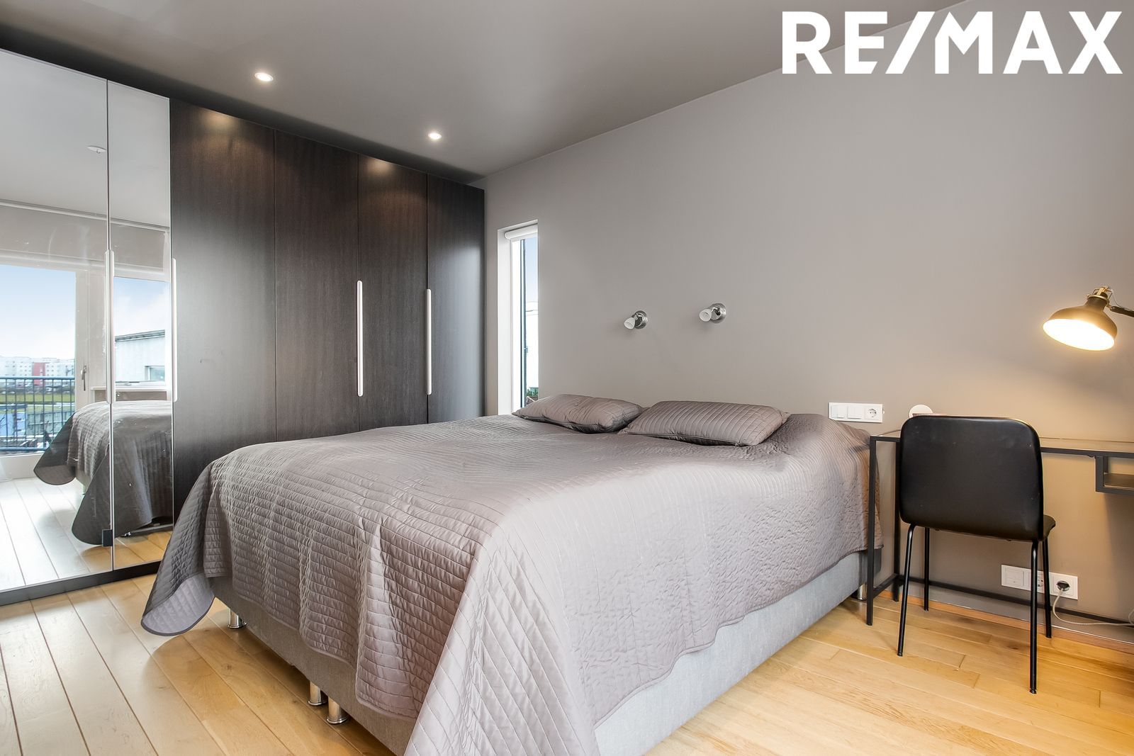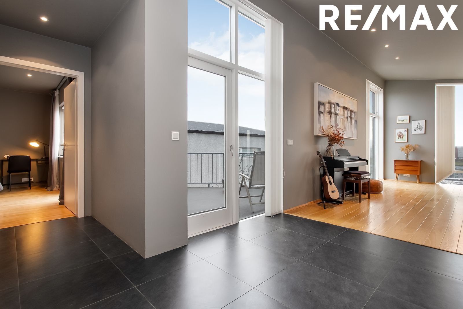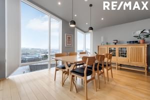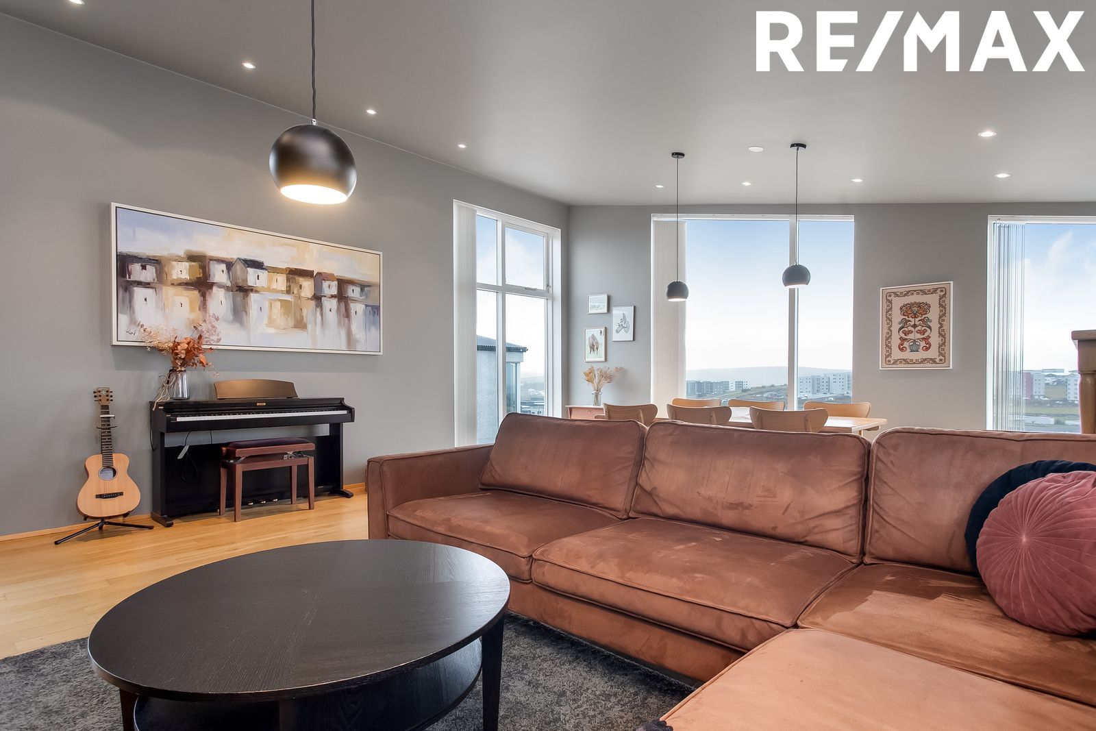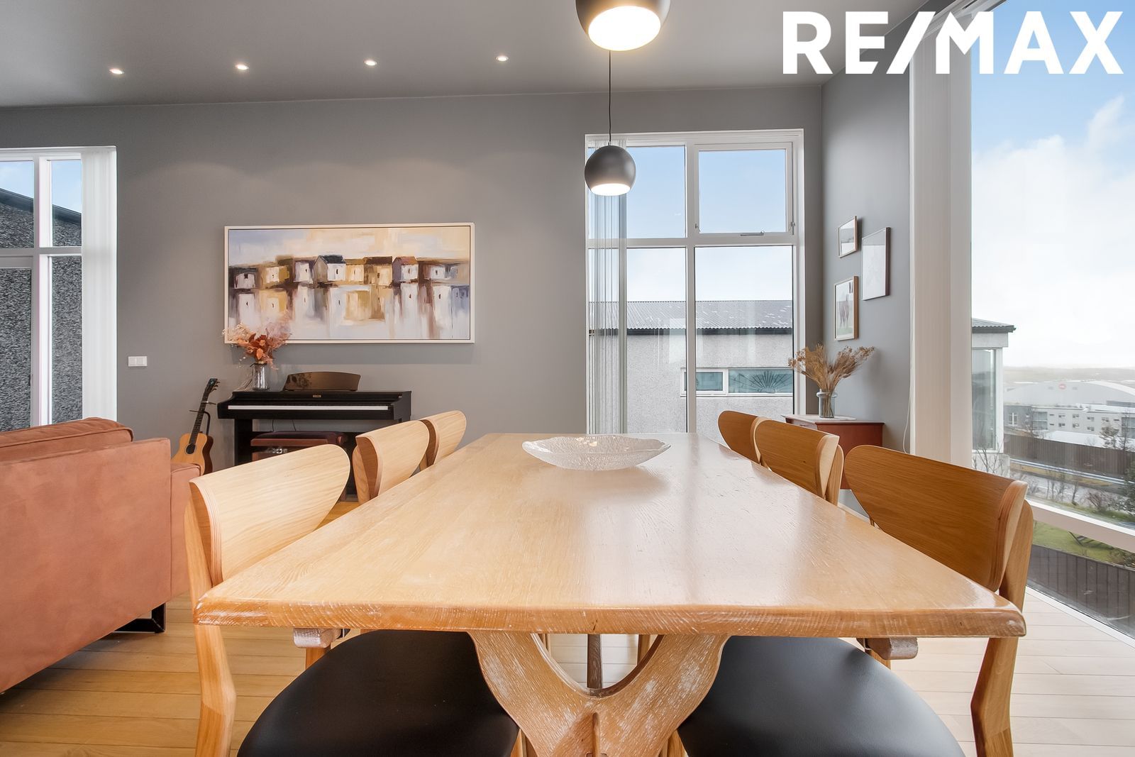 Stofa/borðstofa: Parket á gólfi. Bjart og fallegt rými með aukinni lofthæð og gólfsíðum gluggum. Fallegt útsýni frá rýminu. Útgengt út á 15,2 fm svalir frá rýminu.