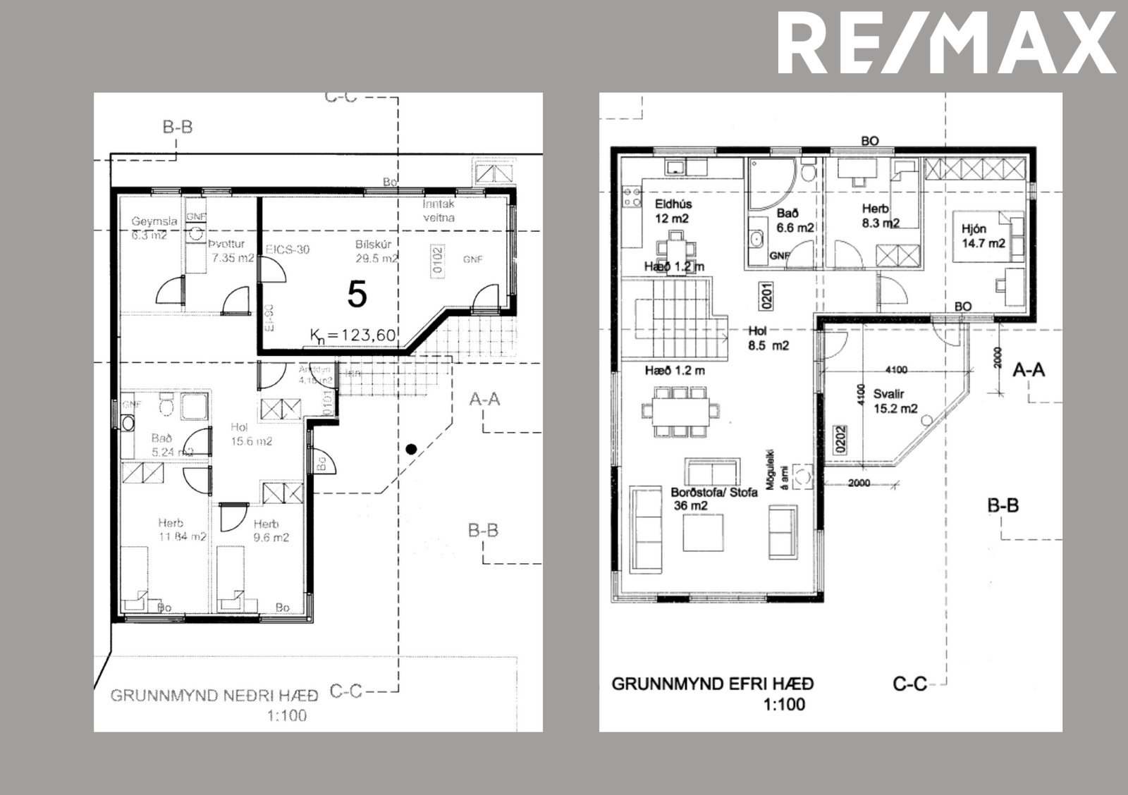 Bílskúr: 34,9 fm. Innangengt í bílskúrinn frá þvottahúsi.